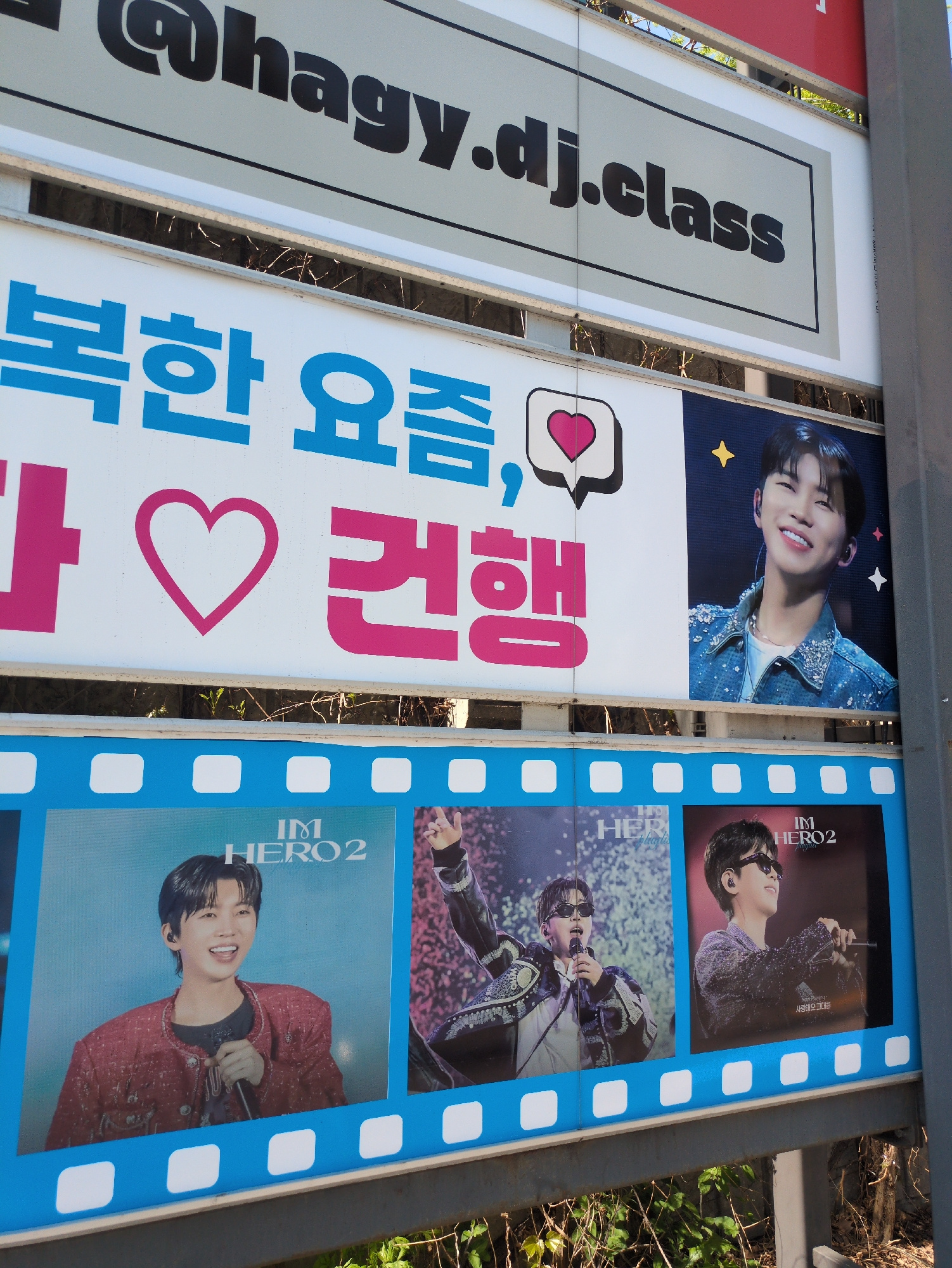 The image shows three adjacent advertising signs set up outdoors, possibly in Seoul, South Korea. The first sign on the left features the text "@hagy.dj.class" in black against a beige background. The…read more