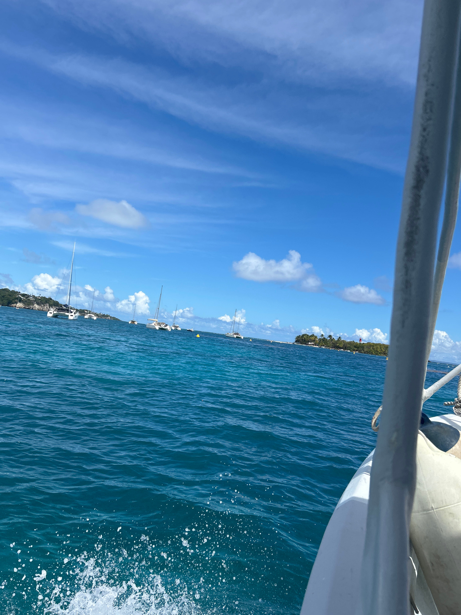The image depicts a view from a boat moving on the water, likely near Le Gosier, France, evidenced by the coastline with vegetation and buildings visible in the distance. The sky is blue with streaks…read more