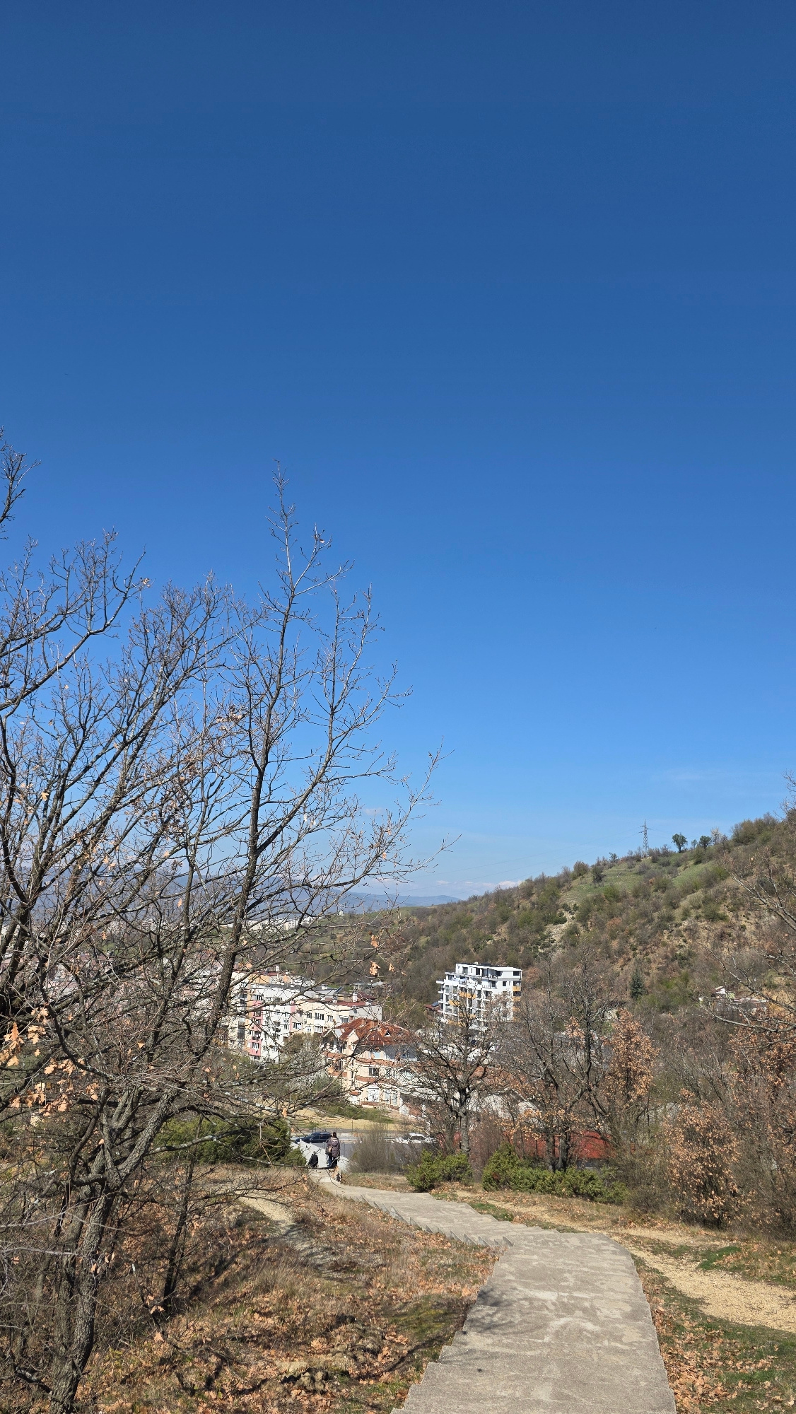 The image depicts a cityscape in Marulevo, Bulgaria, under a clear blue sky. A dense, leafless tree occupies the foreground. A paved path runs diagonally from the upper right toward the middle of theβ¦read more