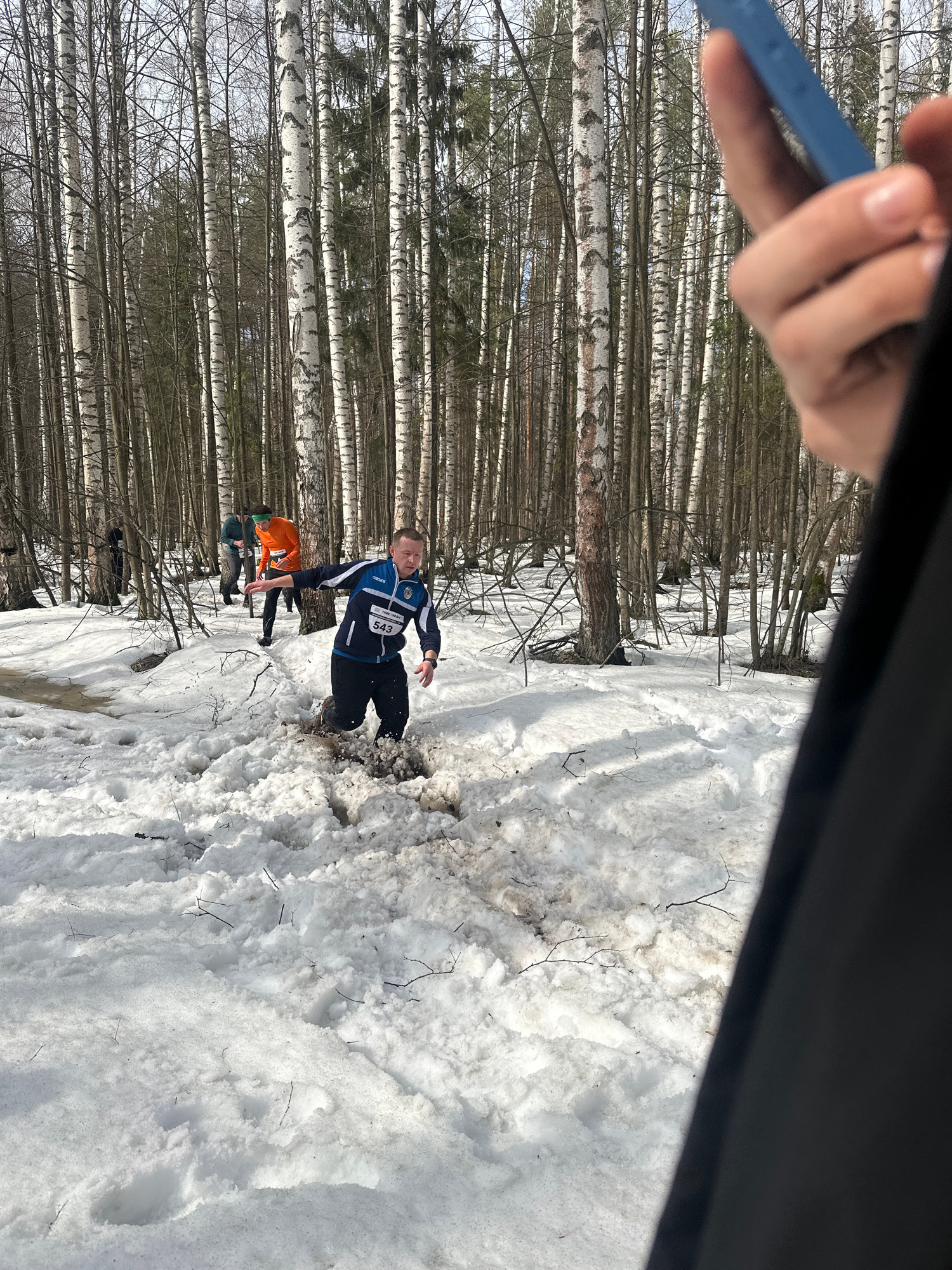 The image depicts a snow-covered landscape with birch trees in the background. A man wearing a blue and black jacket with the number "543" is partially submerged in a patch of muddy snow. Other people…read more