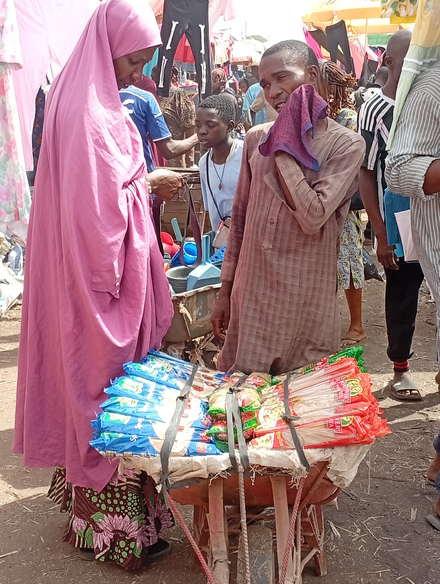 In an outdoor market scene in Kakuri Gwari, Nigeria, a woman clad in a floor-length pink hijab and a patterned skirt examines merchandise on a pushcart. She appears to be inspecting an item, potential…read more