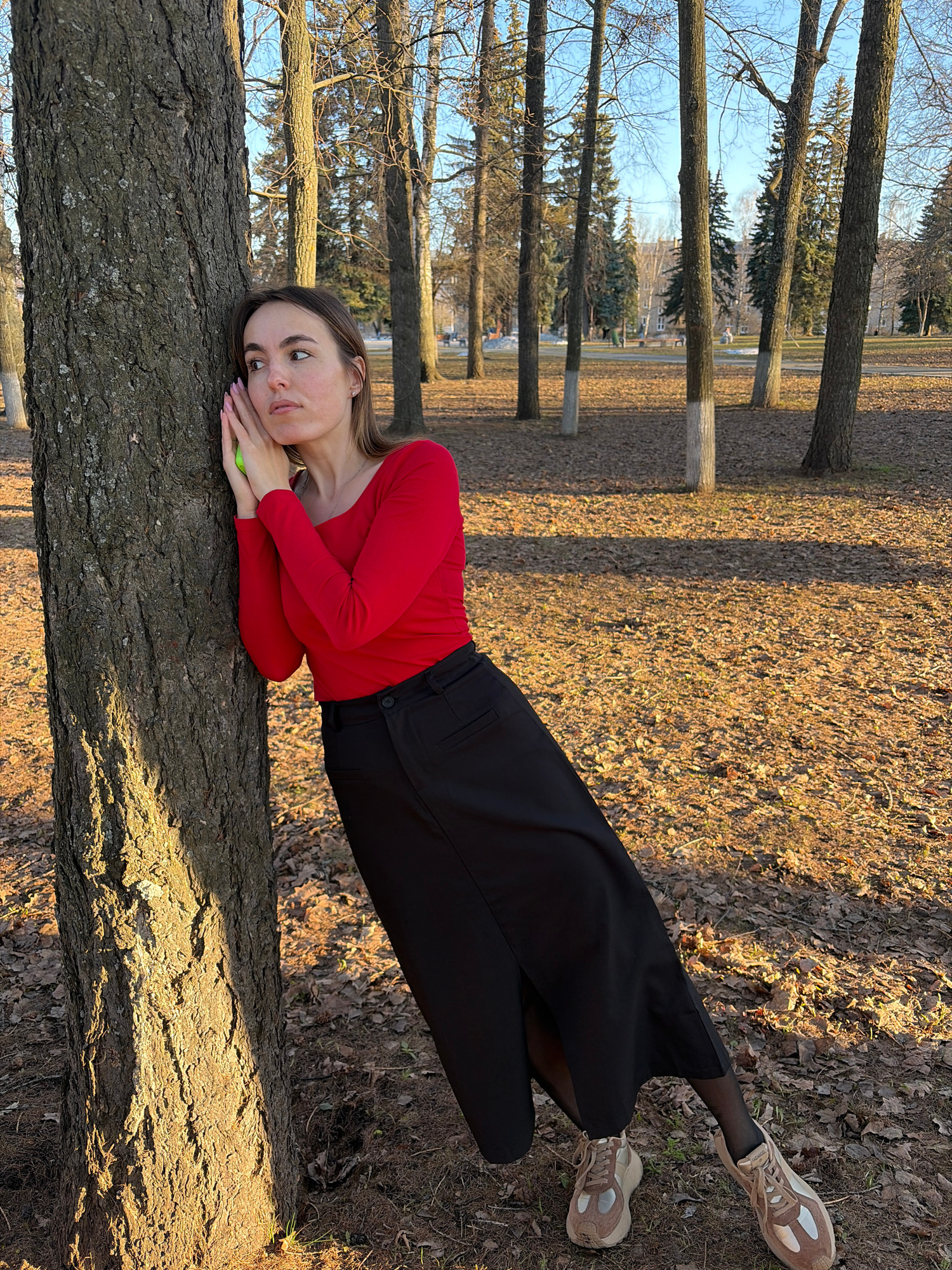 A young woman is reclining on a fallen tree trunk in a park. She is wearing a long-sleeved red top, black pants, sheer black tights, and light brown sneakers. Her head is resting on her folded hands,…read more