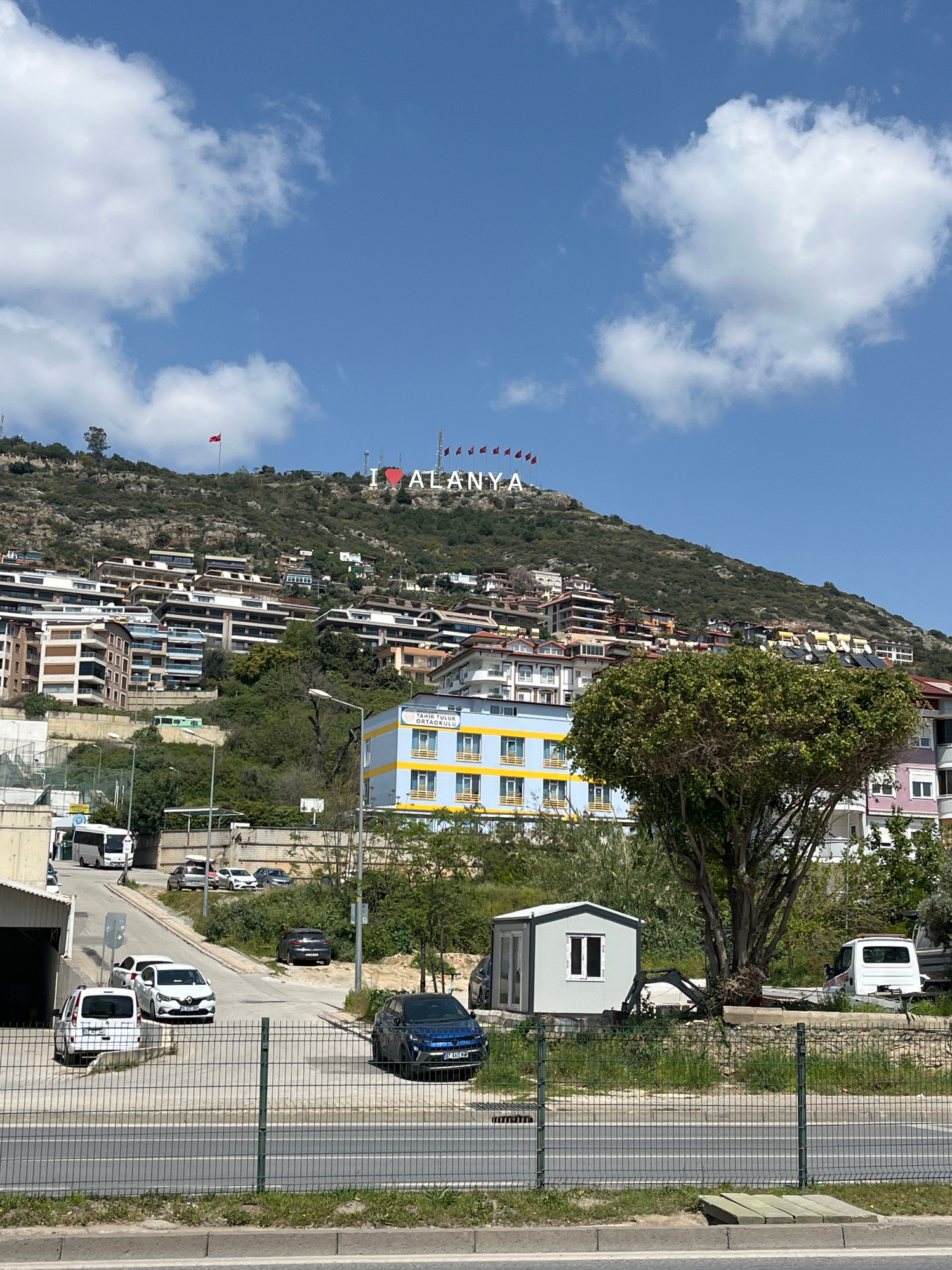 A low-angle view captures a scene in Alanya, Turkey. A mountainside is densely populated with various buildings, including residential apartments and a distinctive blue and yellow school building. The…read more