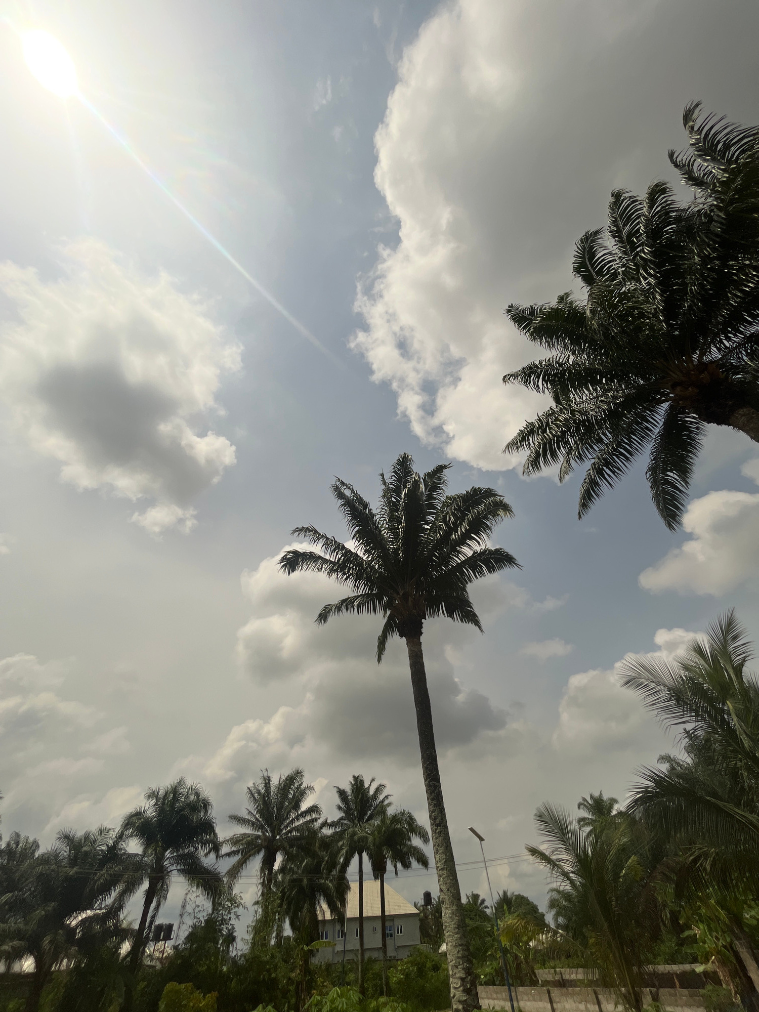 The image depicts a view looking upwards at palm trees against a cloudy sky, likely in Ikot Ekpene, Nigeria. Several palm trees are visible from the trunk to the entire tree. Some buildings appear in…read more