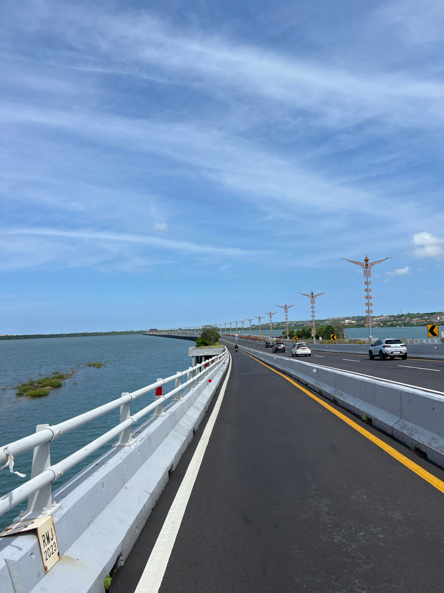 A daytime shot from an elevated position on a bridge with a view of the sky and water. On the right side of the image is the bridge roadway, painted black with a yellow line on the right edge and whit…read more