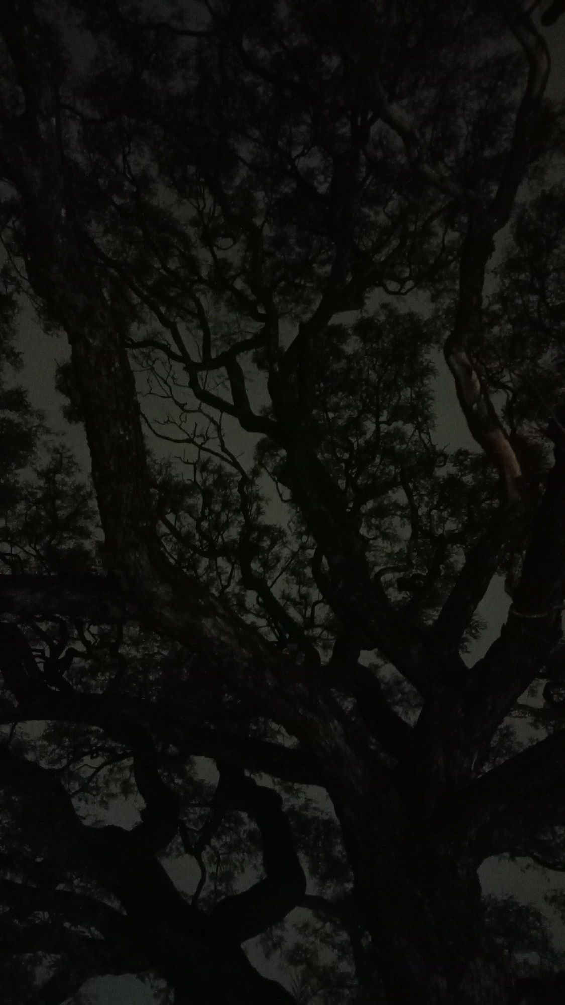 The image shows a low-angle view looking up into a large, dark tree at night, with the sky barely visible through the branches. The tree's trunk is thick and the branches extend densely, filling most…read more