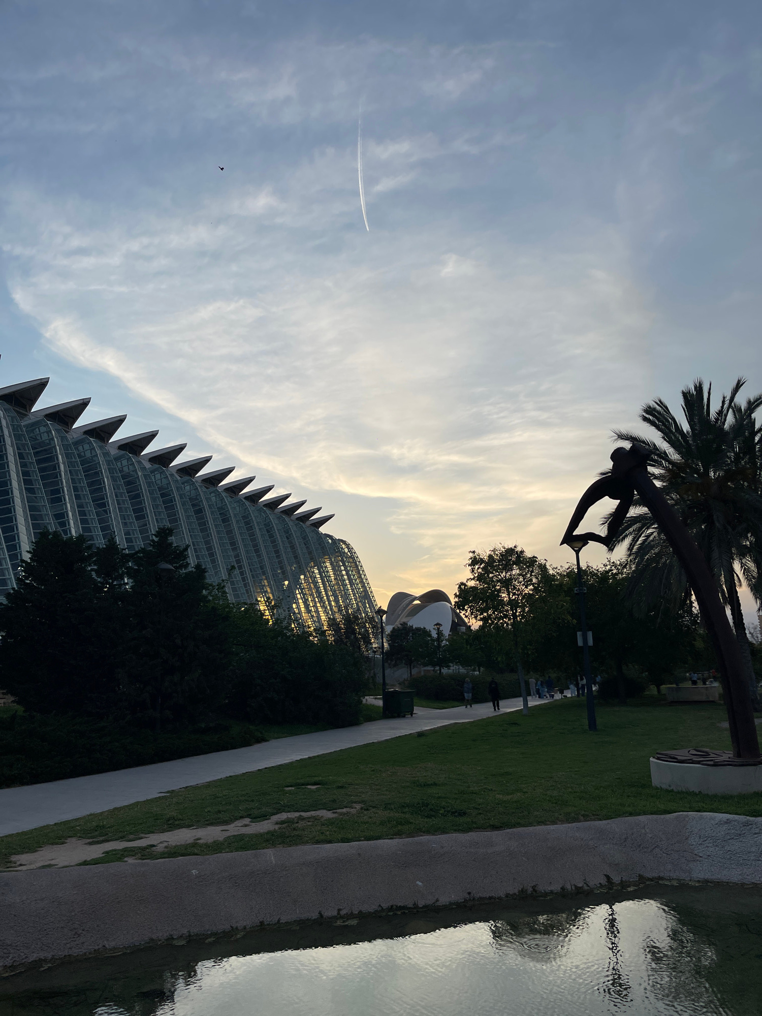 The image captures the City of Arts and Sciences in València, Spain, against a sky with wispy clouds and a contrail. In the foreground stands a modern glass building with a distinctive jagged roofline…read more
