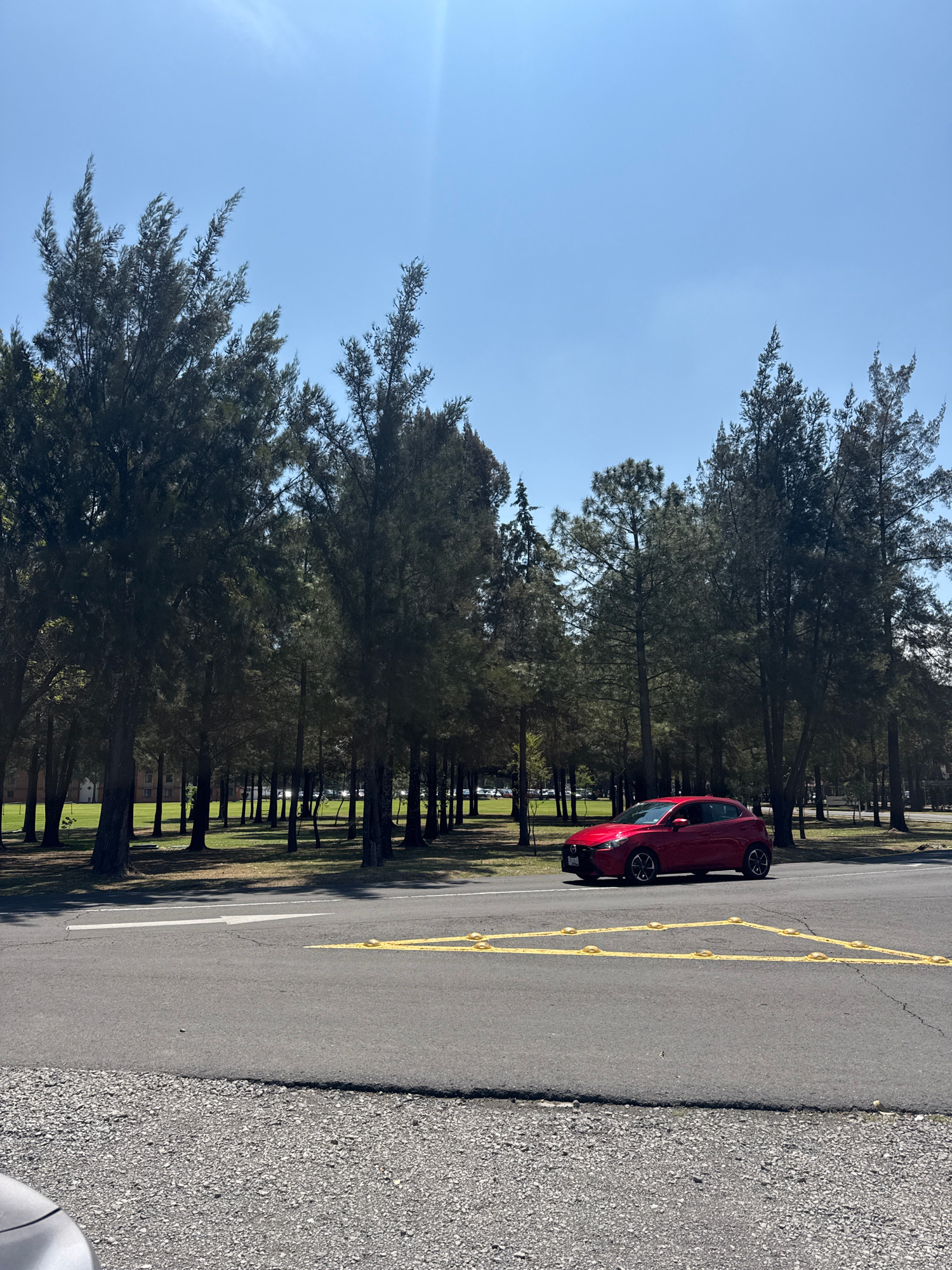 The image shows a red car parked on an asphalt road with yellow road markings, next to a line of tall, dark green trees. Beyond the trees, there is a grassy area with buildings in the distance. The sky is clear and blue. The location is San Andrés Cholula, Mexico. | Open Wire