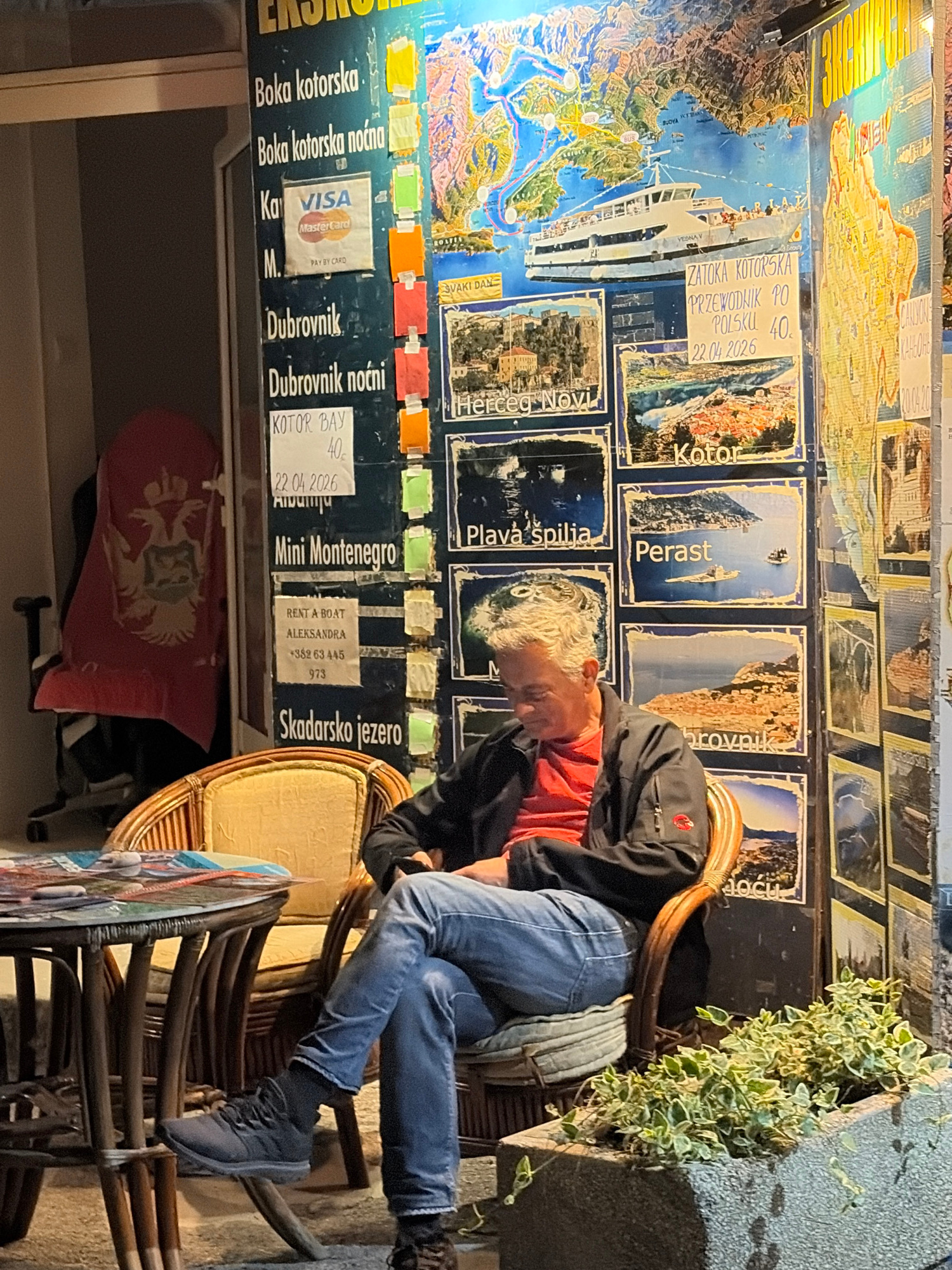 The media file captures an outdoor night scene in what appears to be a commercial area, likely in Budva, Montenegro, as suggested by the local context and visible text. The central subject is a man, p…read more