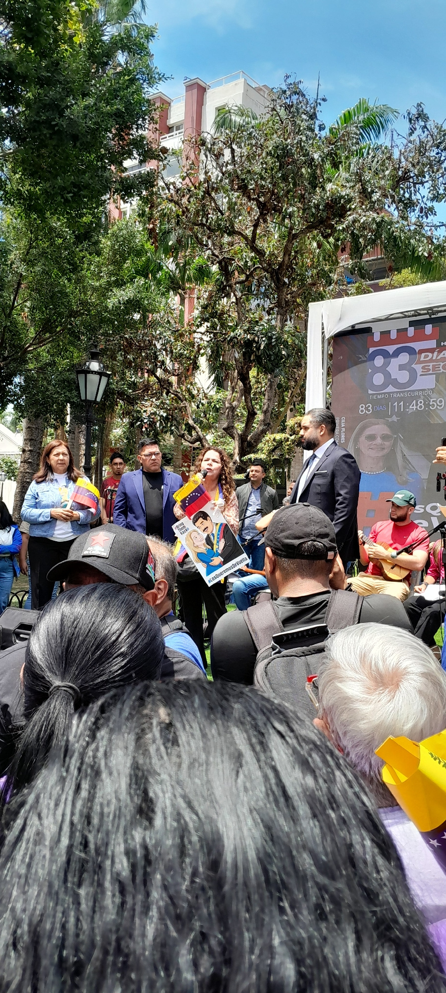The image depicts an outdoor political rally in a public park or square in Caracas, Venezuela, occurring during daylight hours. In the immediate foreground, the backs of multiple attendees' heads are…read more