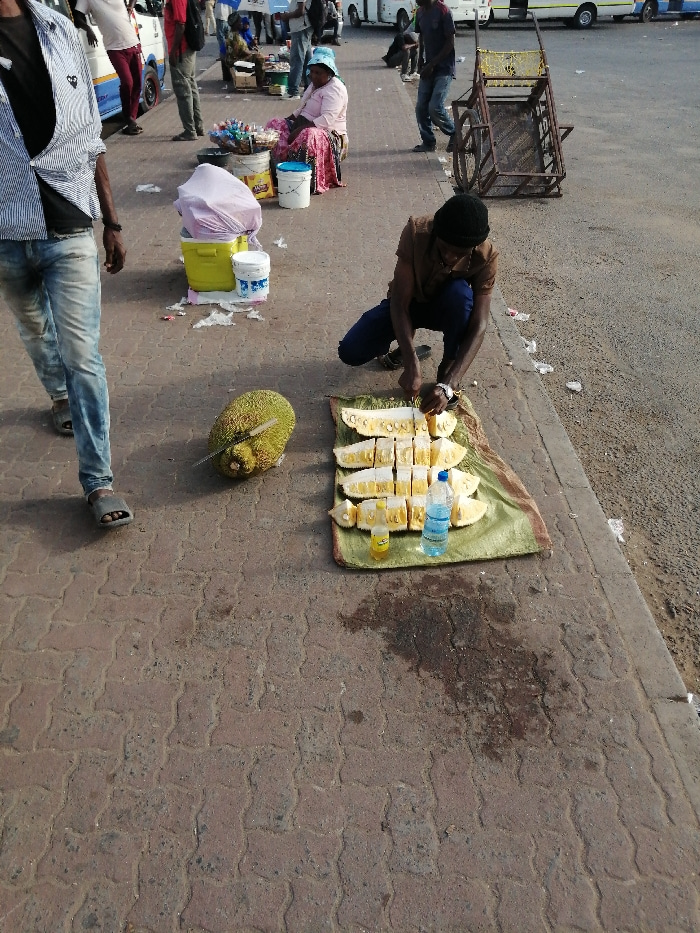 A man kneels, cutting a jackfruit laid on a green cloth on a sidewalk. He has already sliced part of the fruit into several pieces. Beside the sliced jackfruit is a bottle of water and a small jar. A…read more