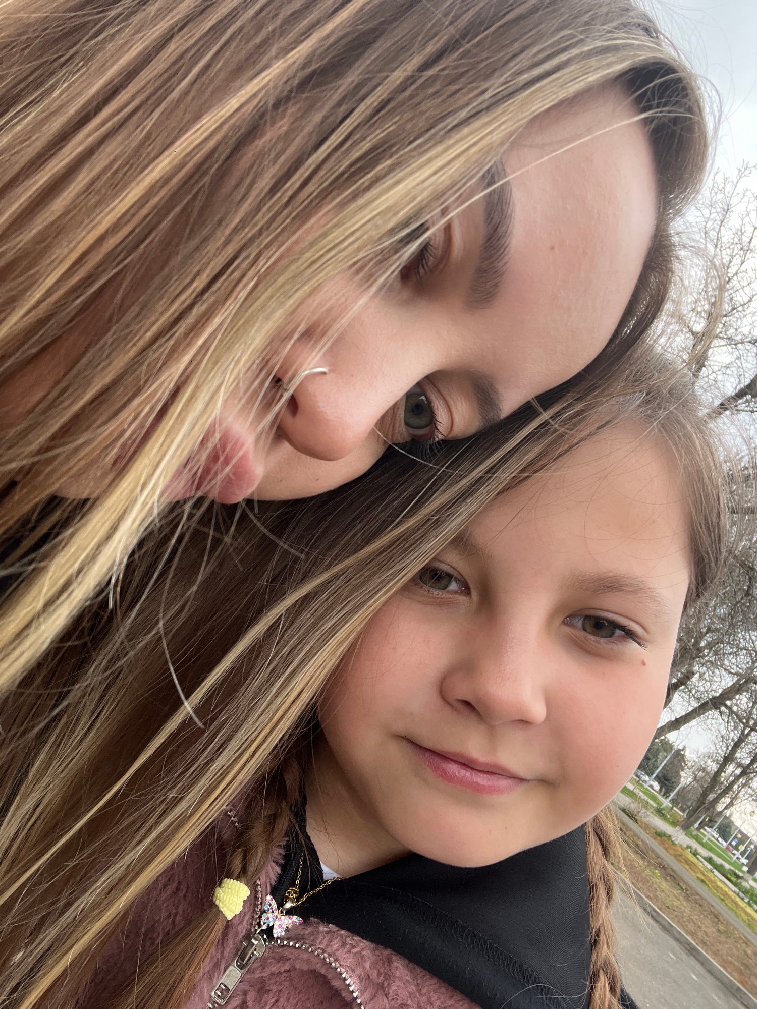 Two females, presumably a young adult and a child, are closely posed for a selfie. The adult is positioned on the left, while the child is on the right. The adult has light brown hair with a visible n…read more