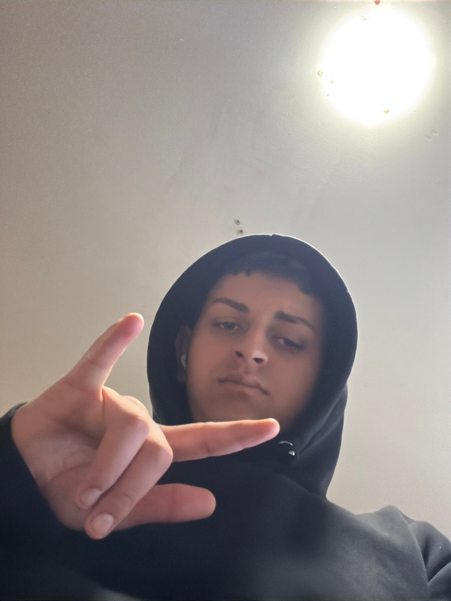 A low-angle shot depicts a person wearing a black hooded sweatshirt. The person is making a hand gesture with their index and pinky fingers extended, resembling the "rock on" or "devil horns" symbol.…read more