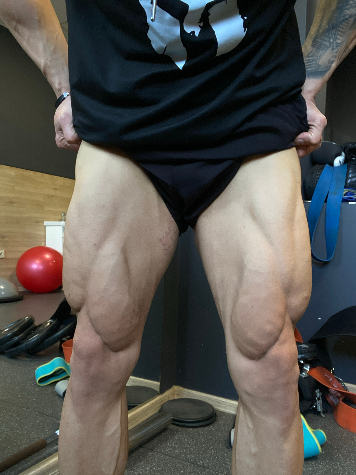 The image depicts a person's legs in what appears to be a gym environment. The person is wearing black shorts. The legs are muscular with visible veins. The background includes gym equipment such as w…read more