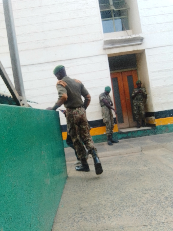 The image shows three individuals in military-style camouflage uniforms and green berets within what appears to be a secure compound or facility in Nairobi, Kenya. In the foreground, an individual wit…read more