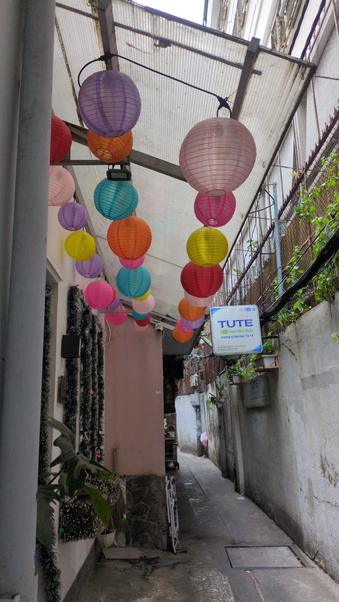 A narrow outdoor alley in Thủ Đức, Vietnam is decorated with colorful paper lanterns strung overhead. Above the lanterns is a translucent corrugated roof and a metal grid overgrown with plants. A sign…read more