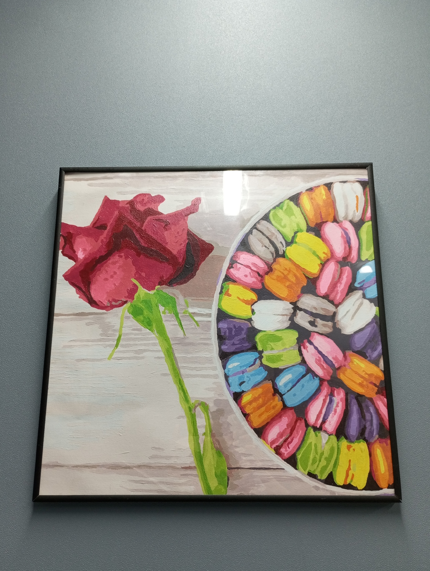 A framed painting hangs on a blue-grey wall. The painting depicts a red rose with a green stem and leaves on the left side. On the right side, it shows a round arrangement of colorful macarons in a dish. The background of the rose is a light-colored, horizontally striped surface. The frame is black. There is a bright reflection on the painting's surface, obscuring some details. This image was not taken in the city of Pervomaysky, Russia. | Open Wire