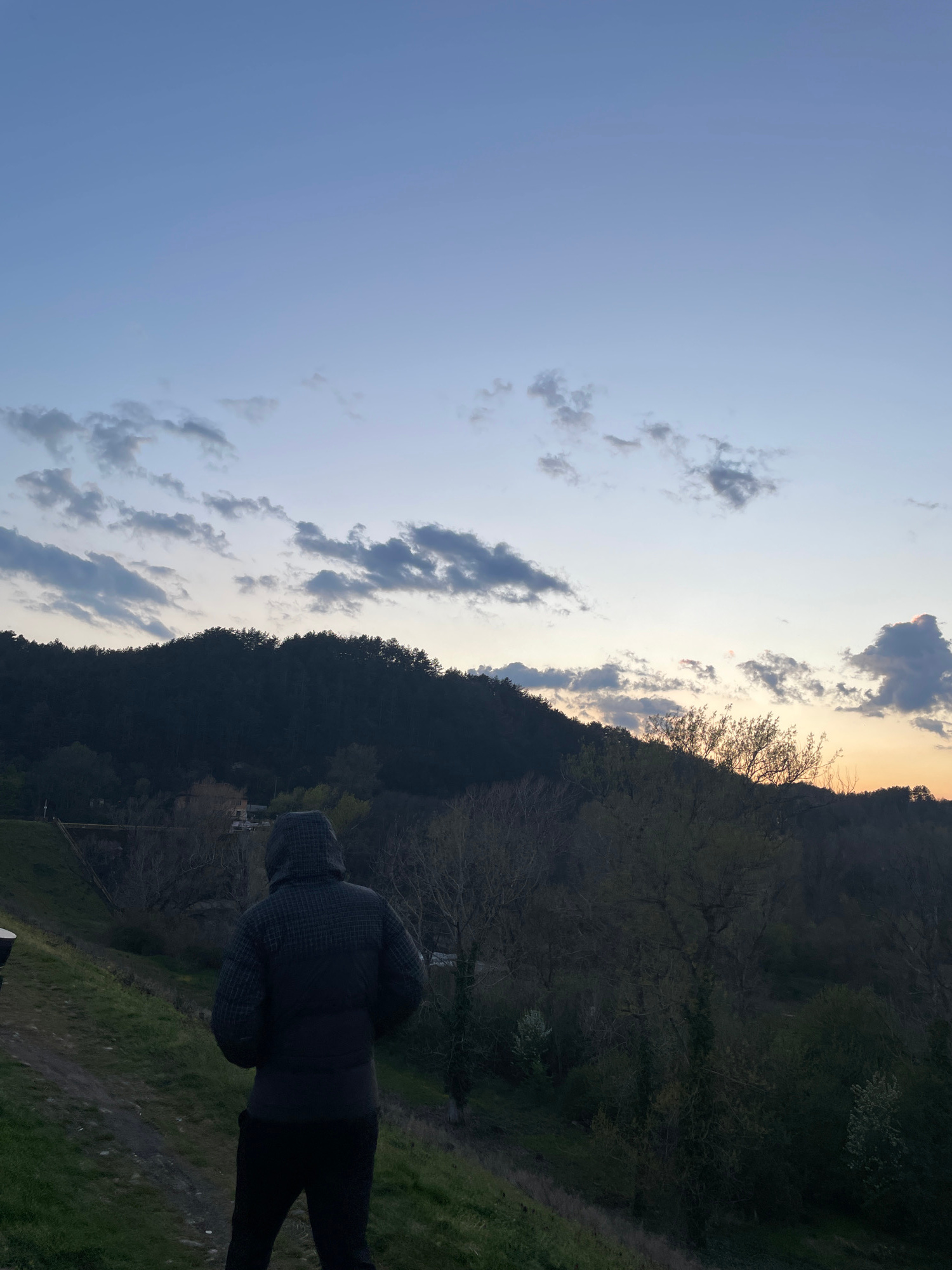 The image shows a person standing on a grassy area in Pancharevo, Bulgaria. The person is wearing dark clothing with a hood. Behind the person, there's a forested hillside. The sky is visible, with cl…read more