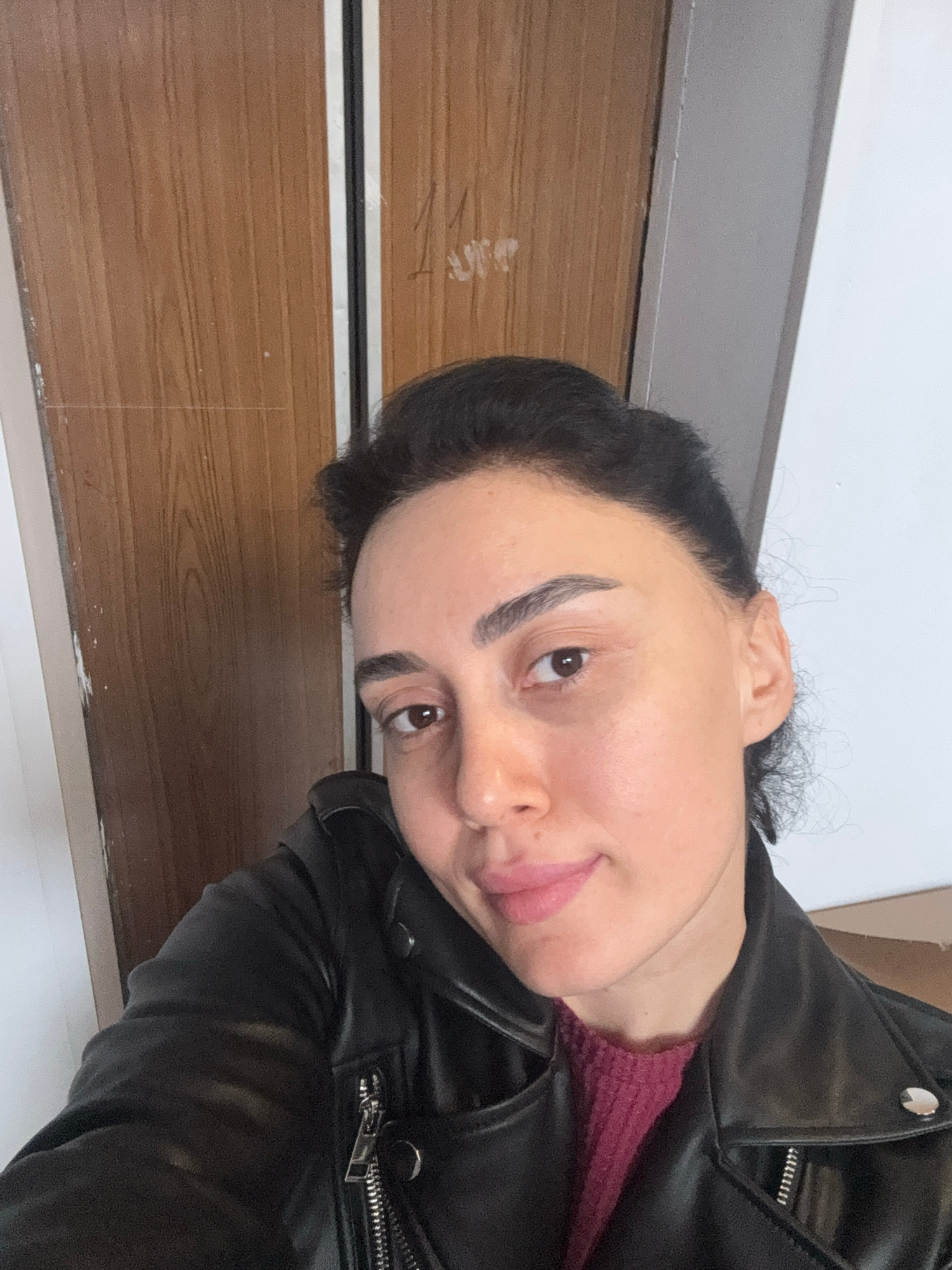 A close-up portrait depicts a female subject from the chest up, centrally positioned and looking directly at the camera with a slight smile. She has dark hair pulled back, dark eyebrows, and brown eye…read more