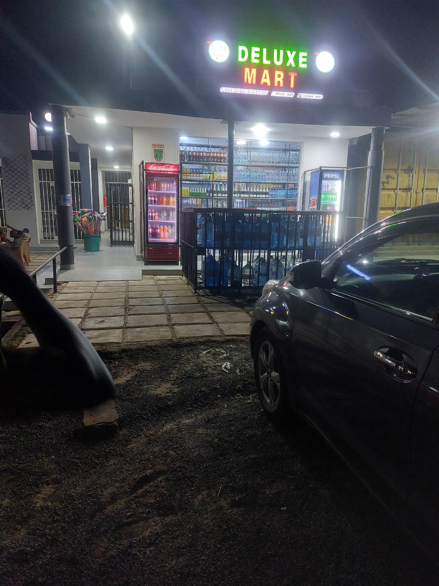 The image shows the exterior of a "Deluxe Mart" convenience store, likely at night, based on the lighting conditions. A dark-colored car is parked closely on the right. Several rows of shelved drinks…read more