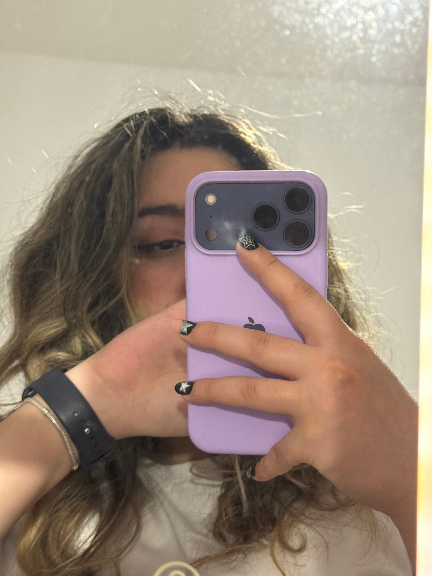 A person is captured taking a mirror selfie, partially obscuring their face with a smartphone. The subject's long, wavy brown hair with lighter highlights frames the visible portion of their face, whi…read more