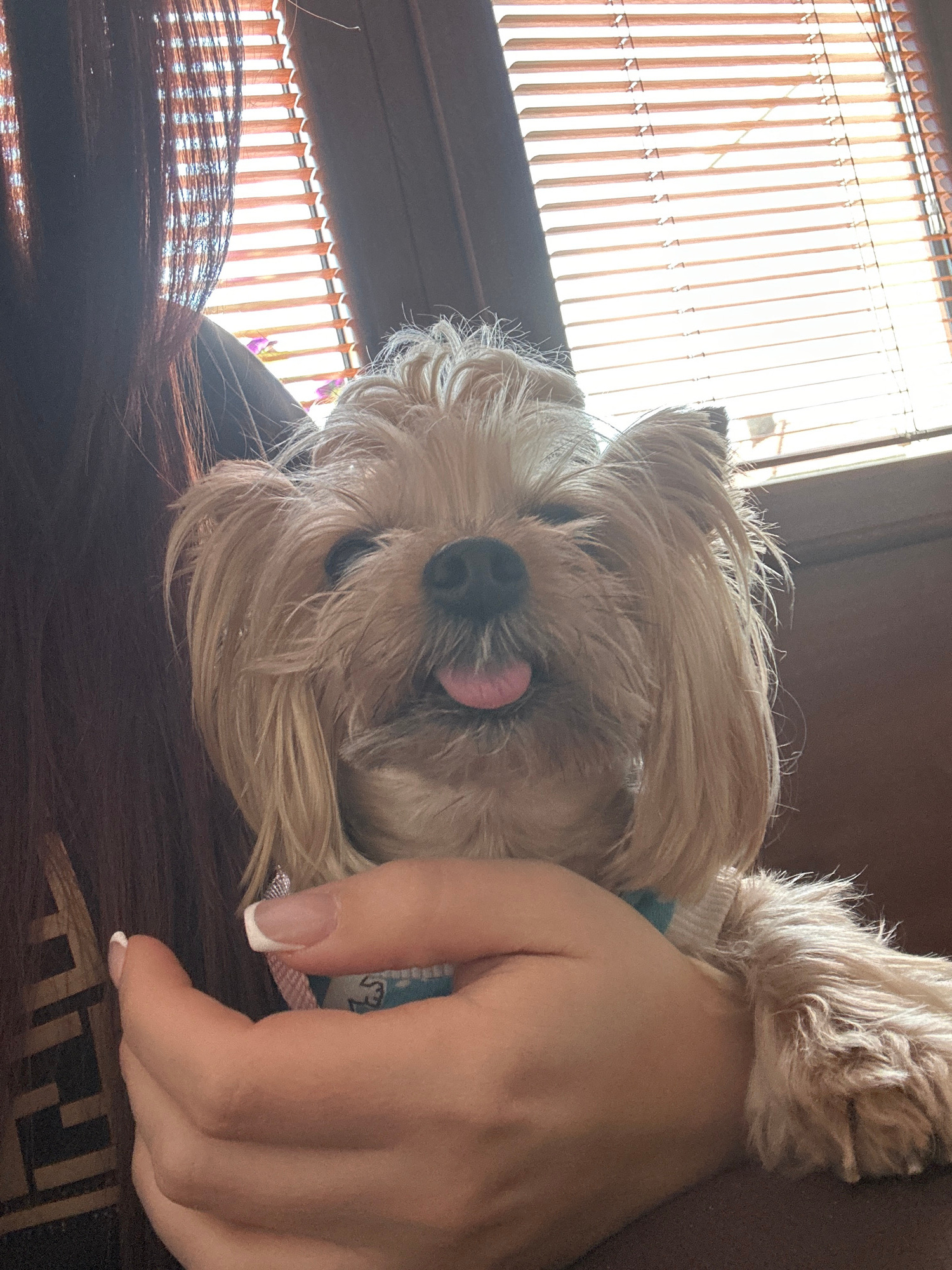 The image depicts a small, light-brown dog lying down, possibly asleep, with its tongue slightly protruding. The dog's head is resting on what appears to be dark-brown hair. A person's hand with a Fre…read more