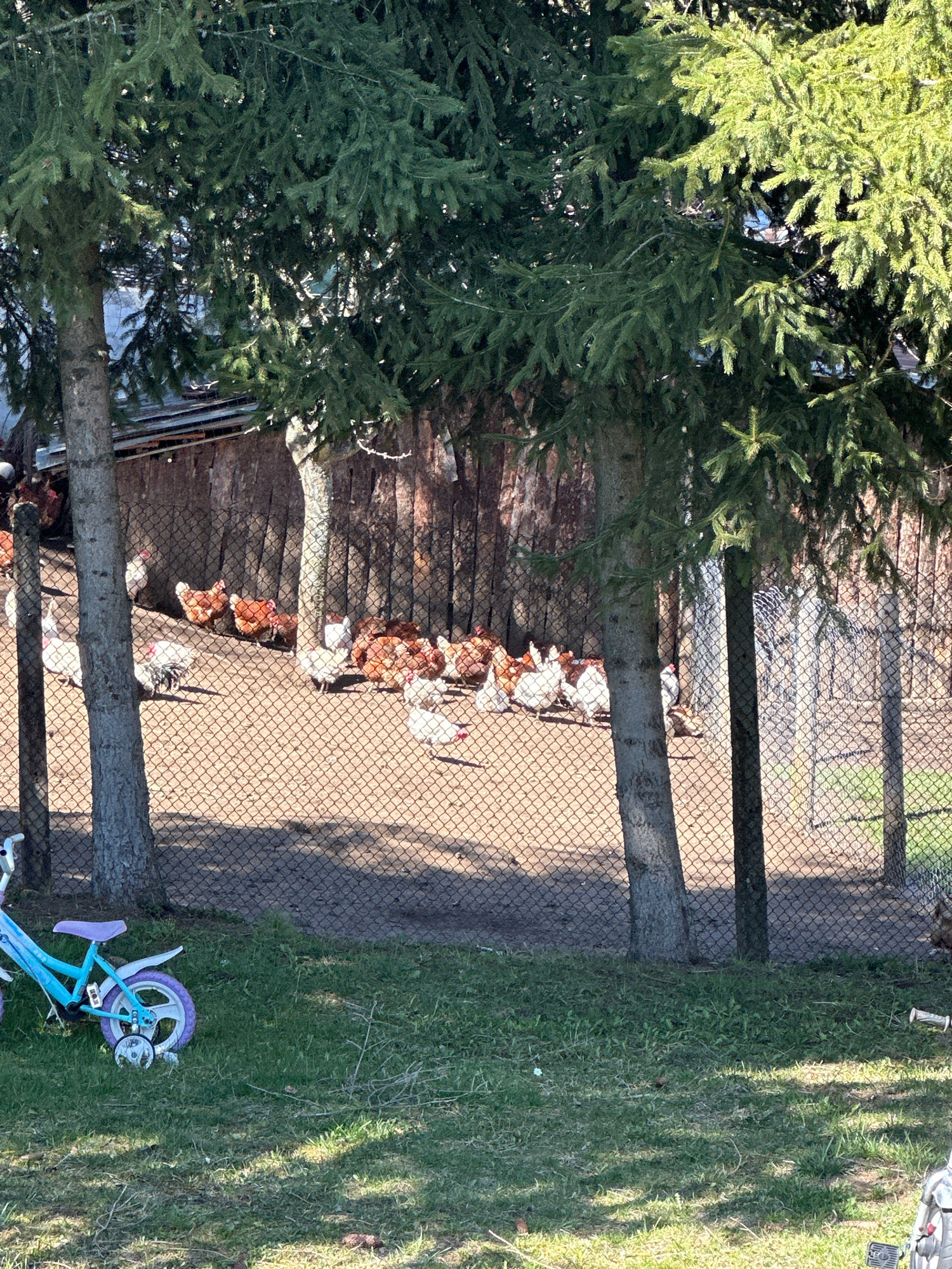 The image shows a chicken coop located in Zheleznitsa, Bulgaria, as evidenced by the surroundings. A chain-link fence encloses the coop, and numerous chickens are present within. A coniferous tree and…read more