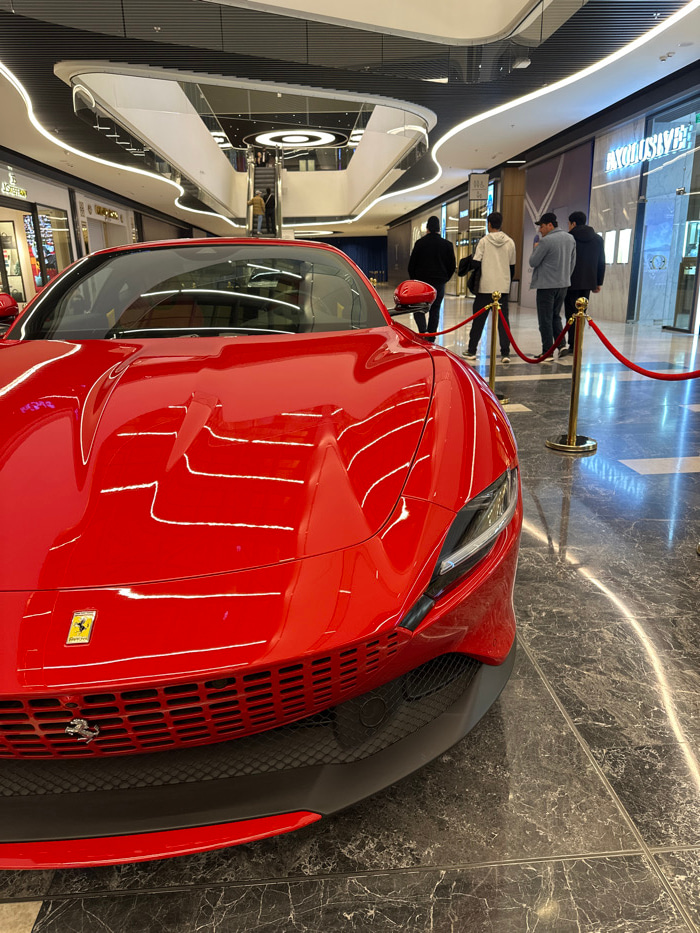 A glossy red Ferrari sportscar is prominently displayed in the foreground of a modern, multi-level indoor shopping mall in Tashkent, Uzbekistan. The vehicle, possibly a Ferrari Roma, faces slightly leβ¦read more