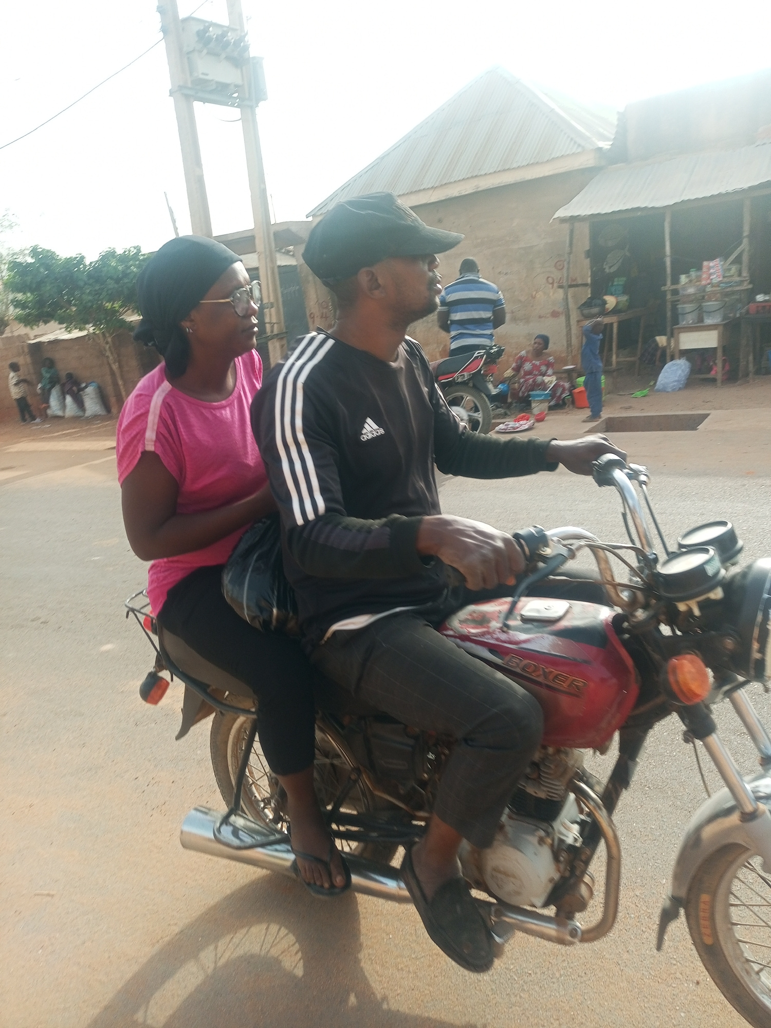 The image depicts a daytime street scene in Timia, Niger. In the foreground, two individuals are riding a red "BOXER" brand motorcycle on a paved road. The driver is a male wearing a black baseball ca…read more