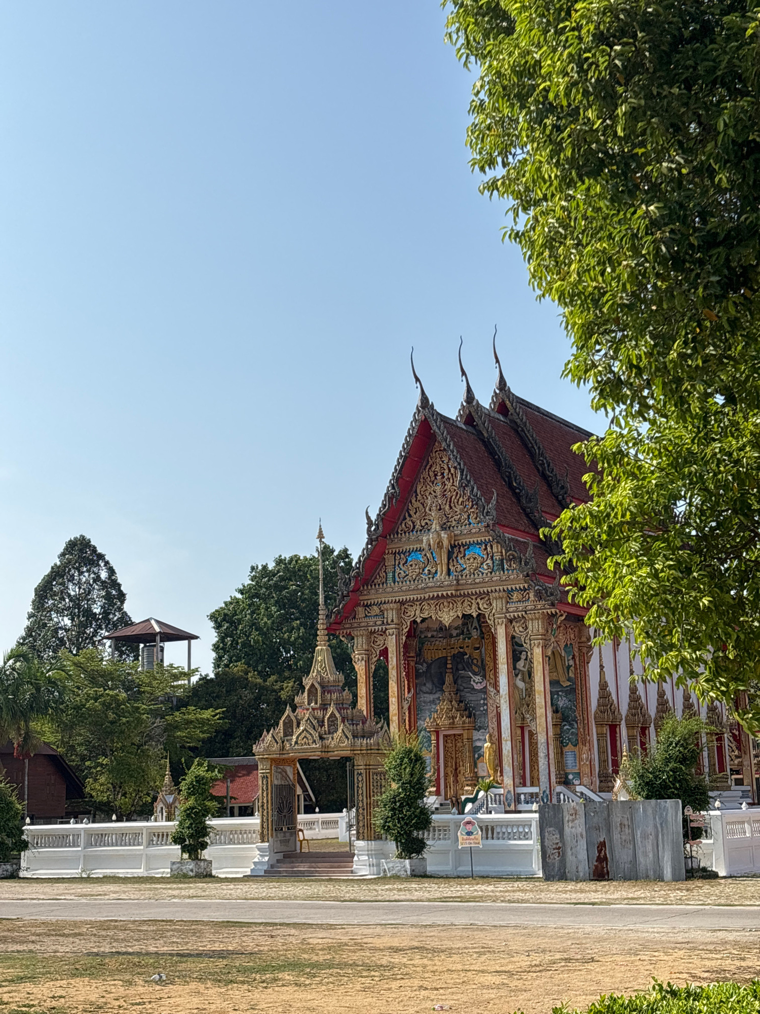 The image, correctly oriented, showcases a vibrant and ornate Thai Buddhist temple (Wat) under a clear blue sky. The main temple building, situated prominently in the mid-ground, features a multi-tier…read more