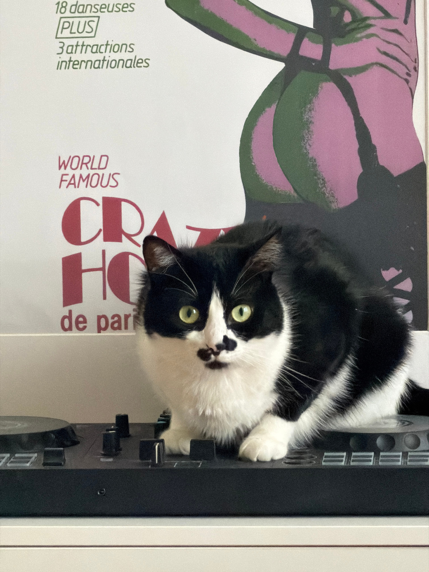 A medium shot captures a black and white cat lying atop a poster bearing the words "World Famous de Paris" and a graphic resembling a reclining female figure. The cat is positioned near a black electr…read more