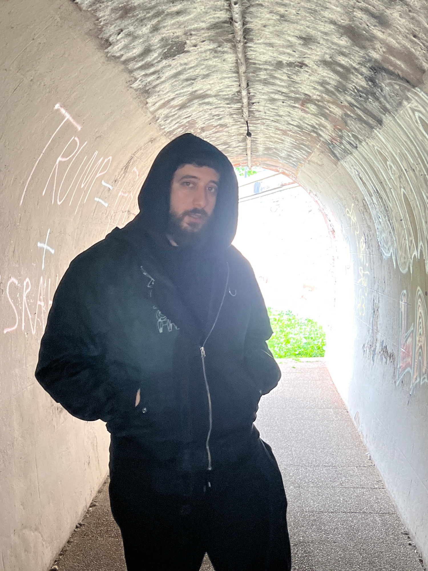 A medium shot depicts a man inside a curved tunnel, likely a pedestrian underpass. He is wearing a black hooded sweatshirt. He has a beard and is looking towards the camera. On the left wall of the tu…read more