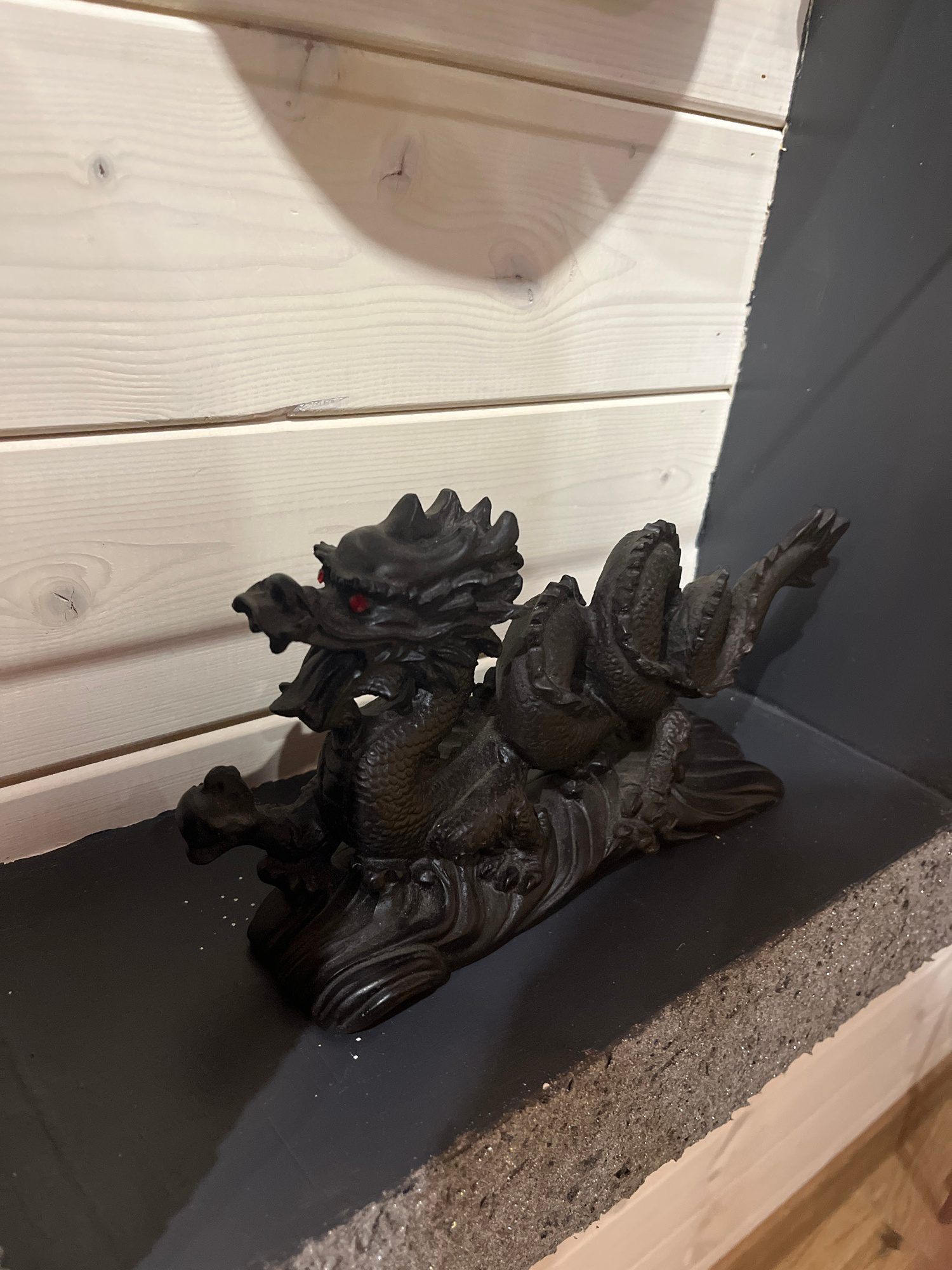 A dark, ornate, possibly antique sculpture, possibly made of wood or a dark-colored resin, is placed in the corner where white, vertically oriented wooden planks meet a wall with a gray painted upper…read more