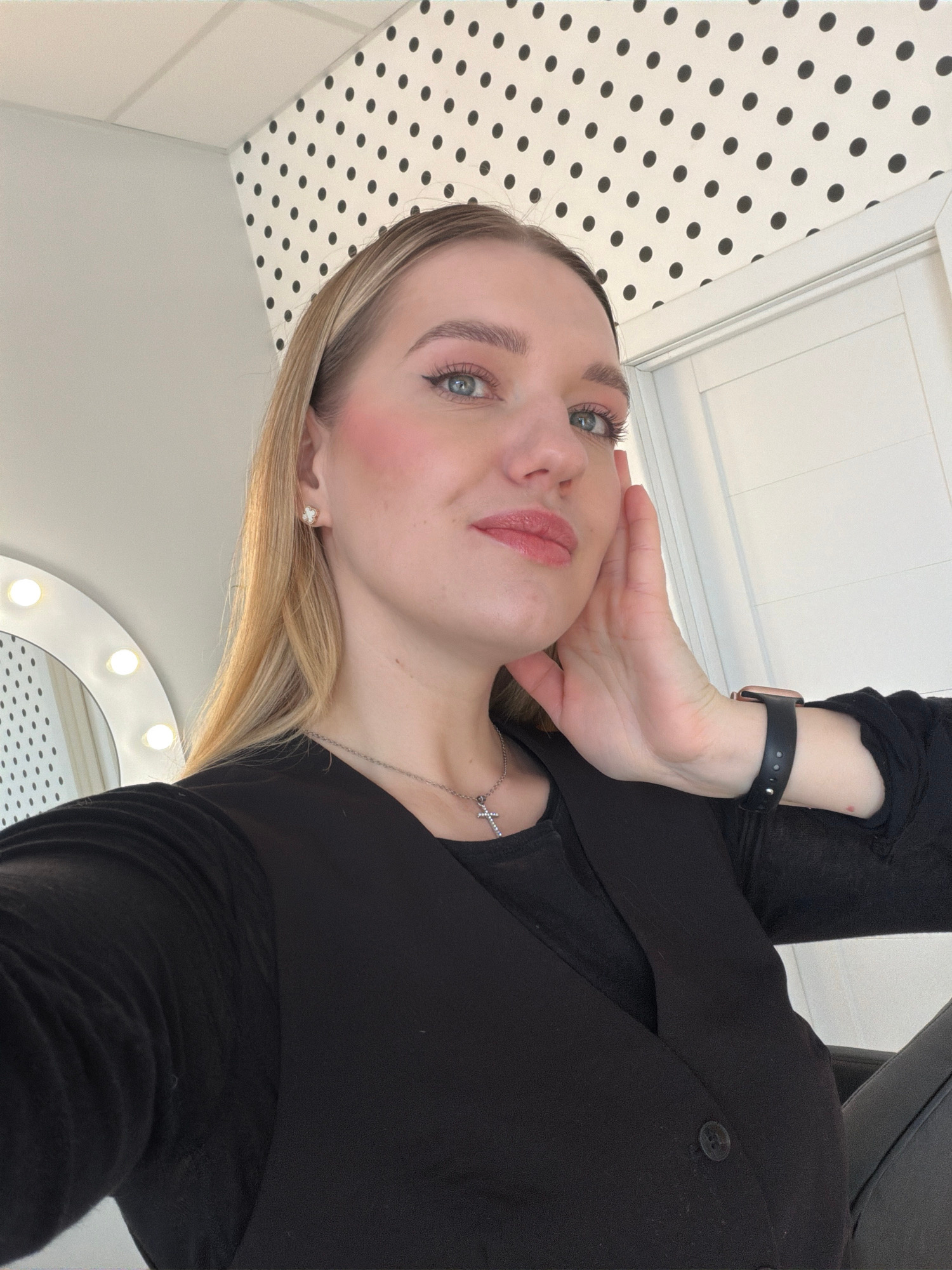 A selfie-style portrait features a young woman looking directly at the camera, with the image rotated 90 degrees clockwise. She has light-toned skin, light blonde hair pulled back from her face, and b…read more