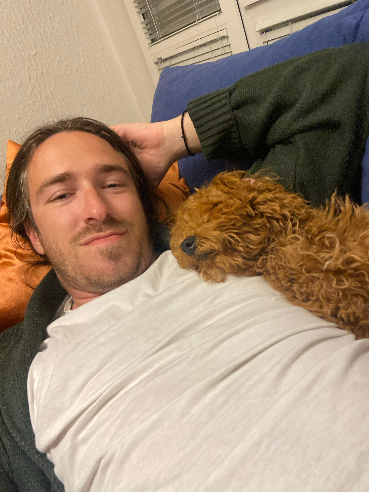 A man is lying on his back with a small, reddish-brown dog resting on his chest. He is fair-skinned with brown hair and a short beard. He's wearing a dark green sweater and a white shirt. The man appe…read more