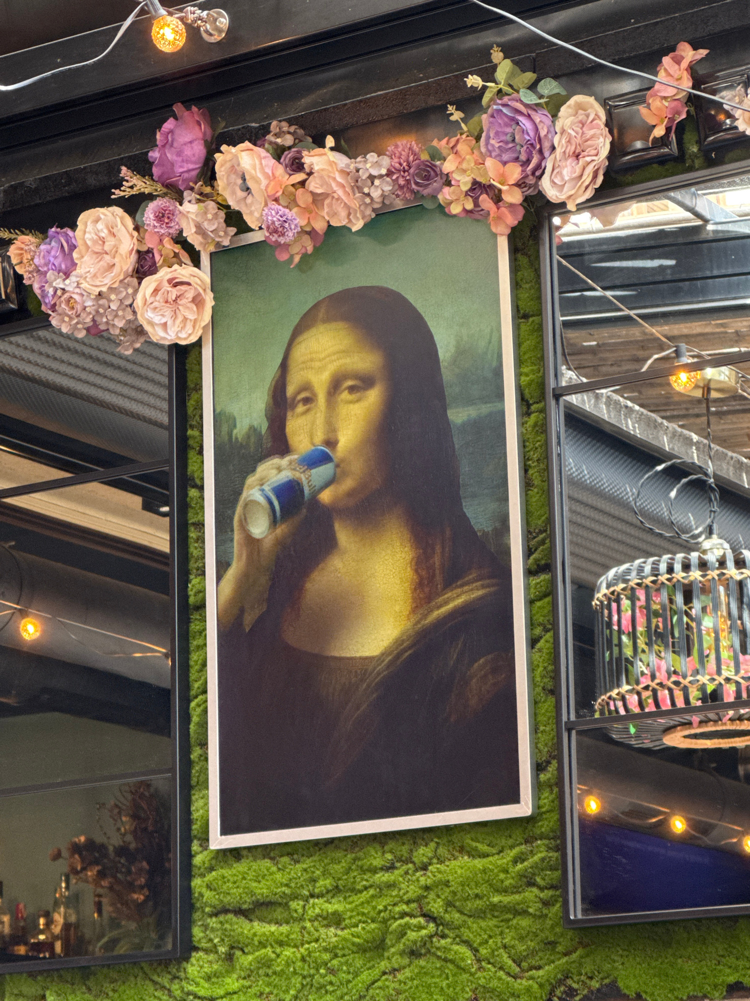 The image shows a framed print of the Mona Lisa drinking a can of Red Bull. The print is hung on a wall covered in green moss. The frame of the print is white. Surrounding the Mona Lisa print are a se…read more
