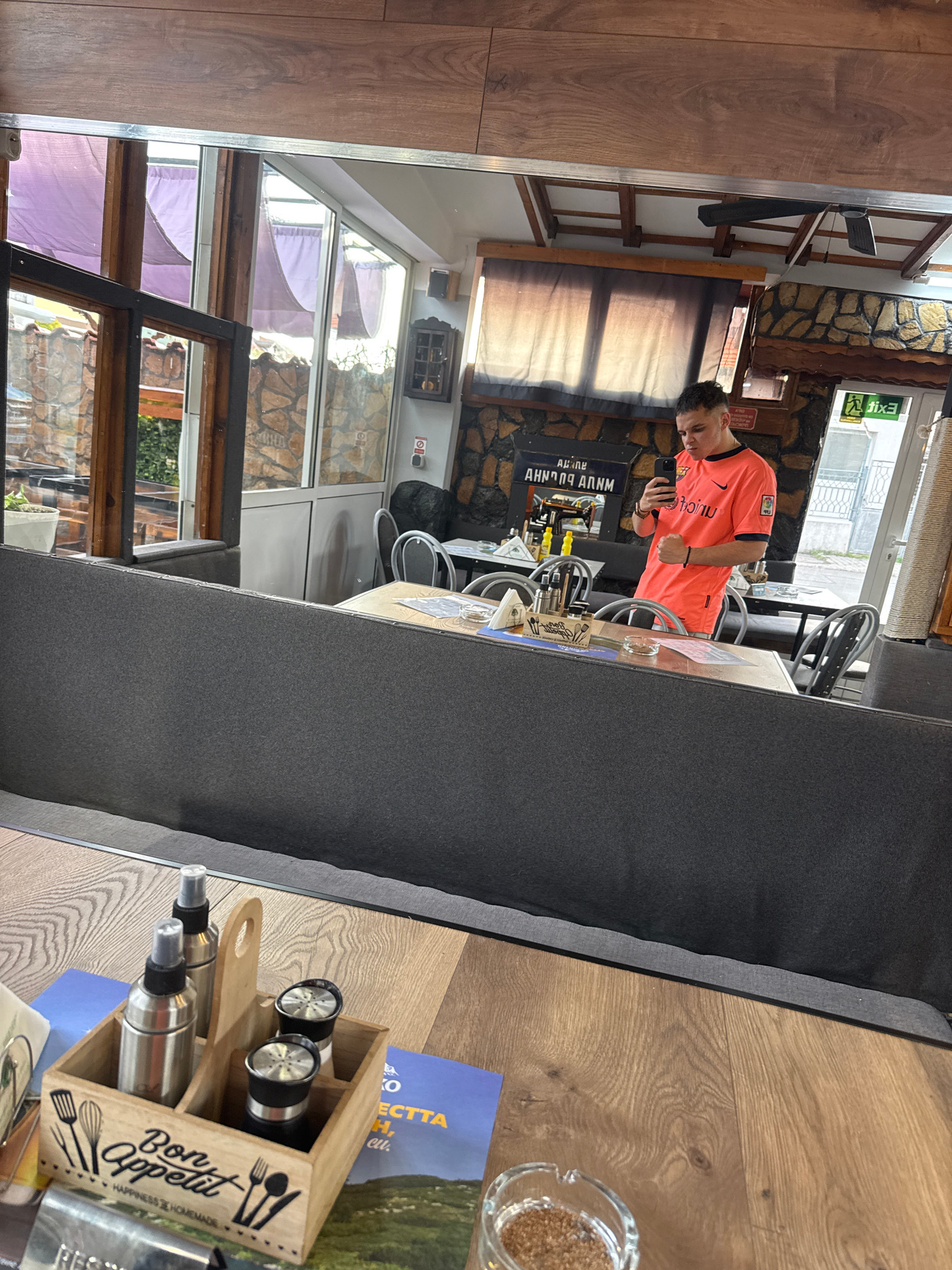 The interior of a restaurant in Kostinbrod, Bulgaria, is captured in this photograph. The image shows a man in an orange Barcelona soccer jersey taking a picture of himself in a mirror. The mirror refβ¦read more