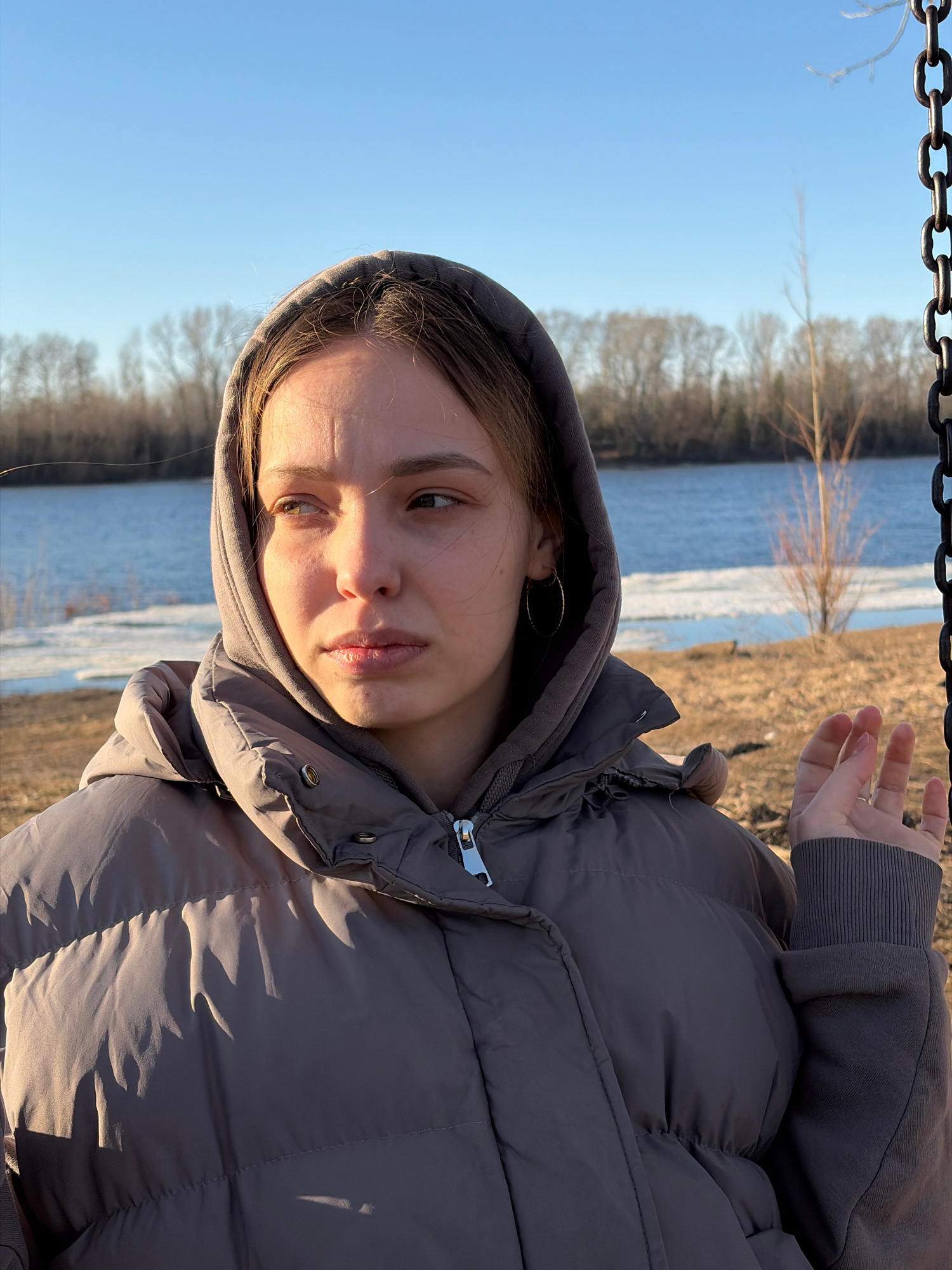 A woman wearing a gray hooded puffer jacket is positioned in the foreground of the image, with a body of water, possibly the Kama River, and shoreline visible in the background. The water appears to h…read more