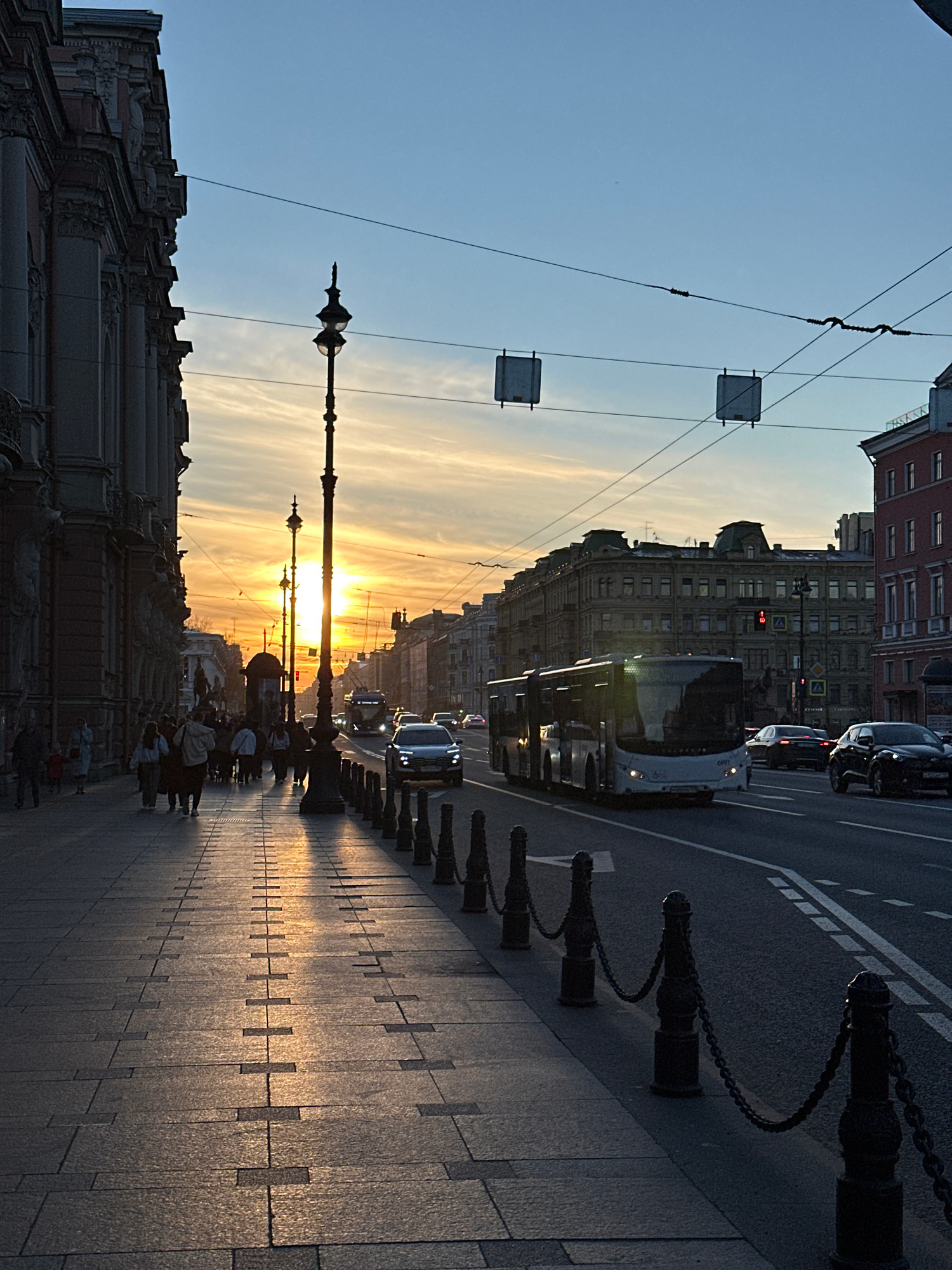 The image shows a street scene in Saint Petersburg, Russia, during sunset. The sun is visible in the distance, casting a golden glow along the Nevsky Prospekt, the main street. Several buses and cars…read more