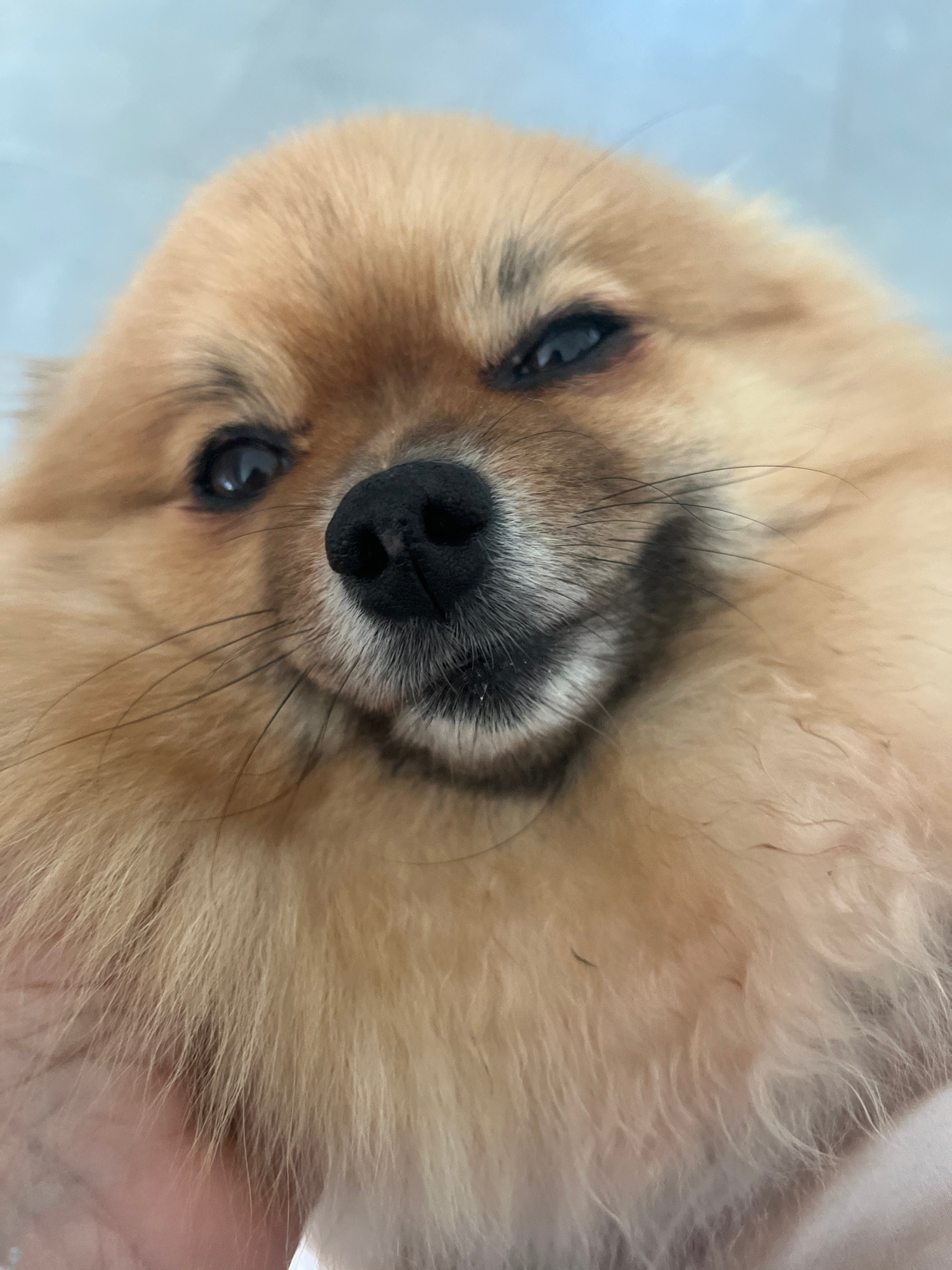 A close-up photograph features the head of a small, fluffy dog, likely a Pomeranian, with light brown or tan fur. The dog's dark, expressive eyes look directly into the camera, and its prominent black…read more