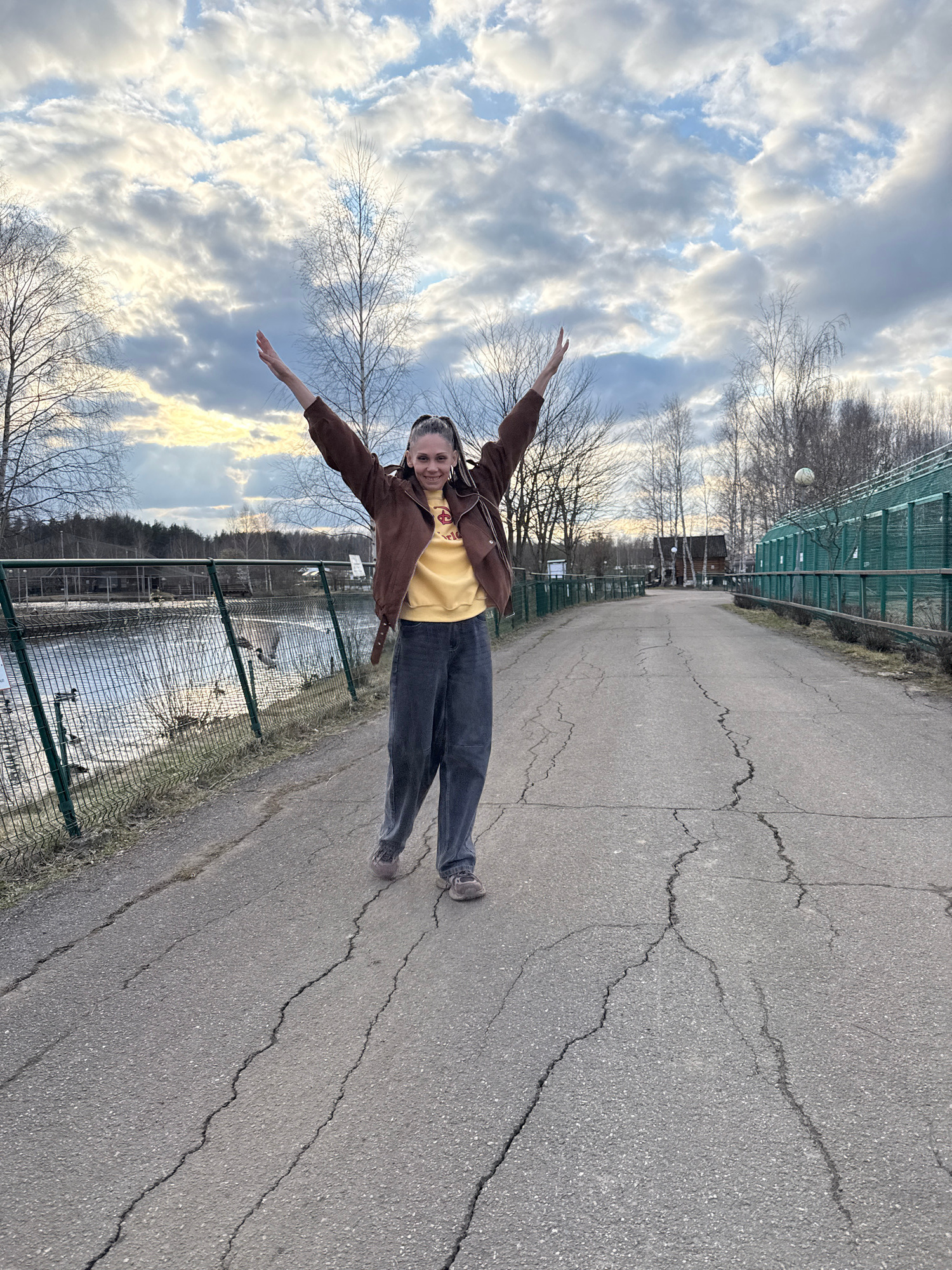 A photograph taken outdoors depicts a woman positioned on a paved surface, possibly a path or road, with a backdrop featuring trees, cloudy skies, and what appears to be a fenced enclosure or area. T…read more