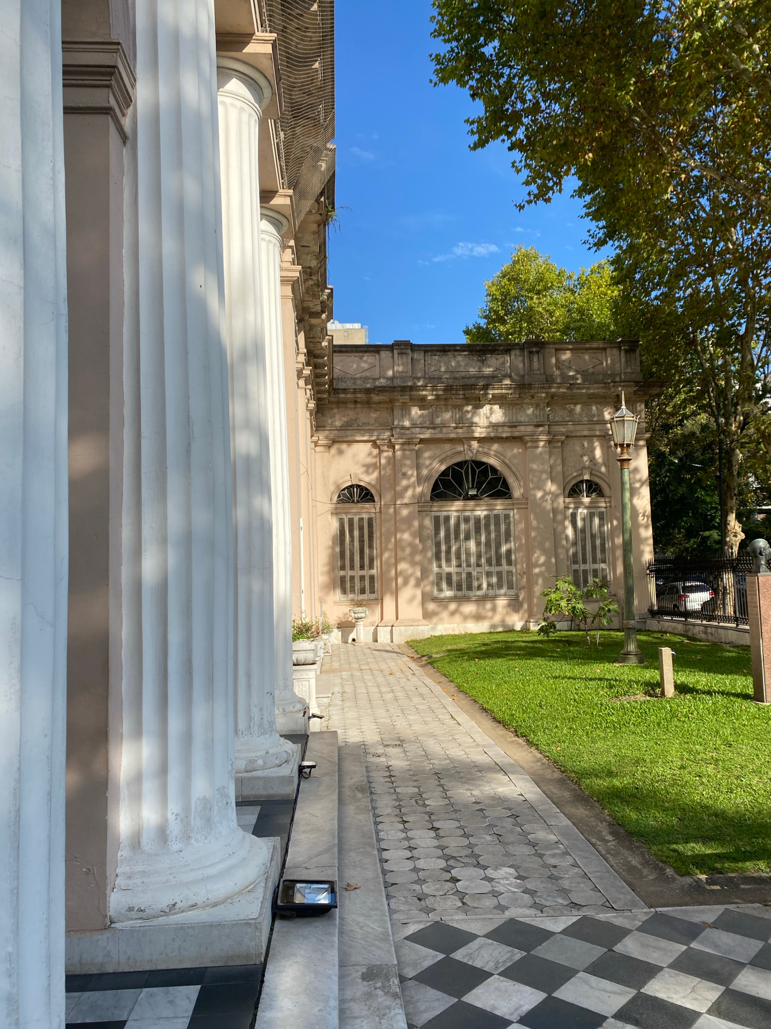 The image shows the facade of the Museo de Arte Hispanoamericano Isaac Fernández Blanco in Buenos Aires, Argentina. The building is a two-story, light-colored structure with arched windows and decorat…read more