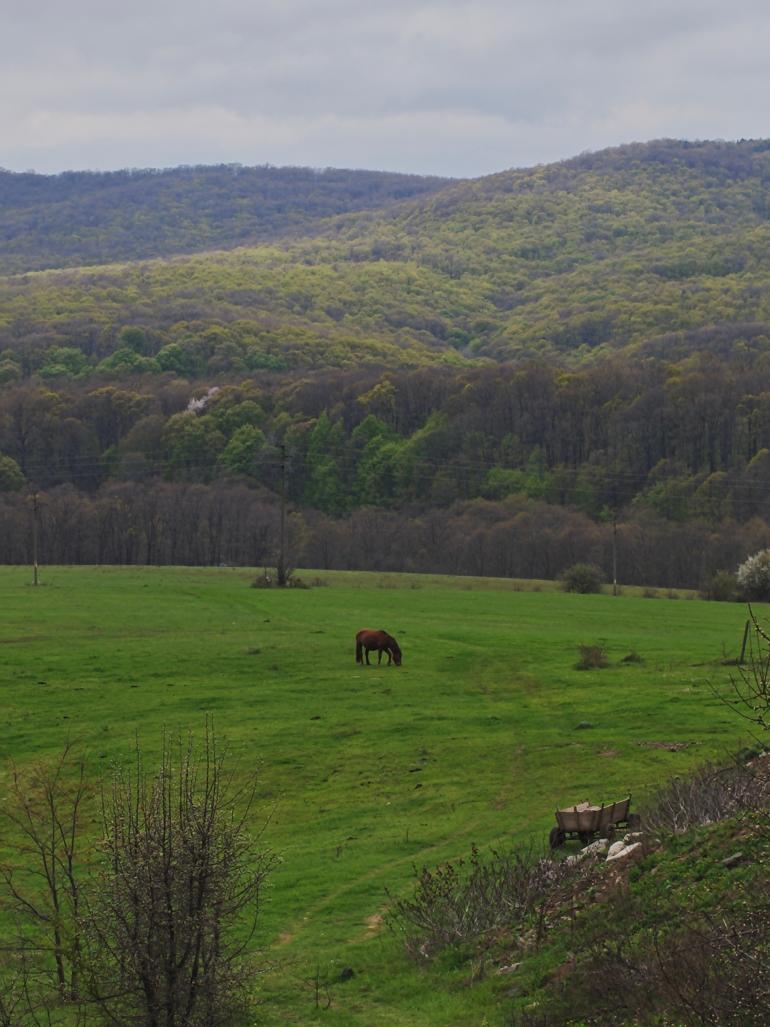 The image presents a tranquil rural landscape in Izgrev, Bulgaria, under an overcast sky. A lush, vibrant green field dominates the lower two-thirds of the frame, hinting at early spring with its fres…read more