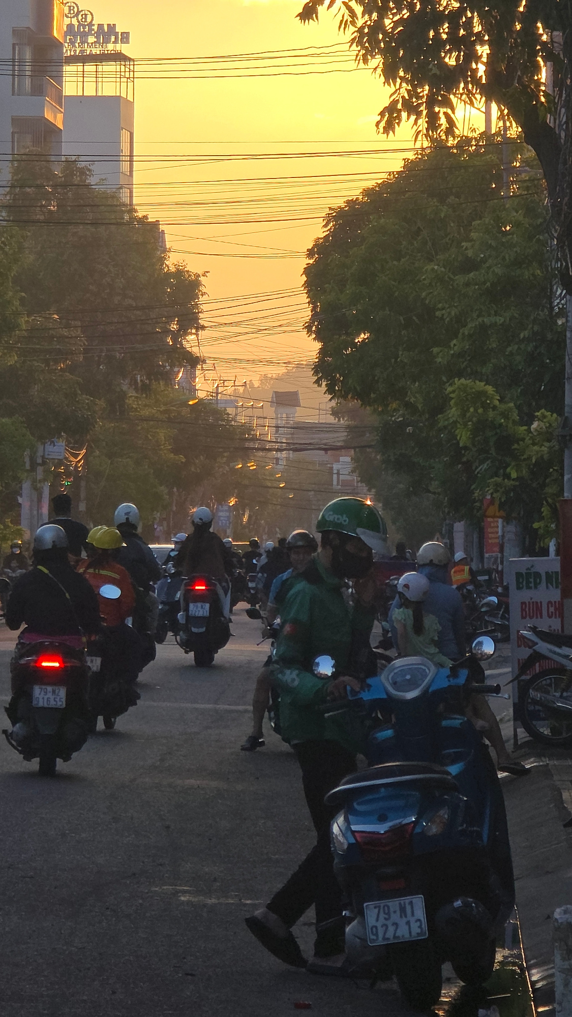 The image captures an urban street scene in Nha Trang, Khanh Hoa province, Vietnam, during the golden hour, with a bright orange-yellow sky indicating either sunrise or sunset. The perspective is from…read more