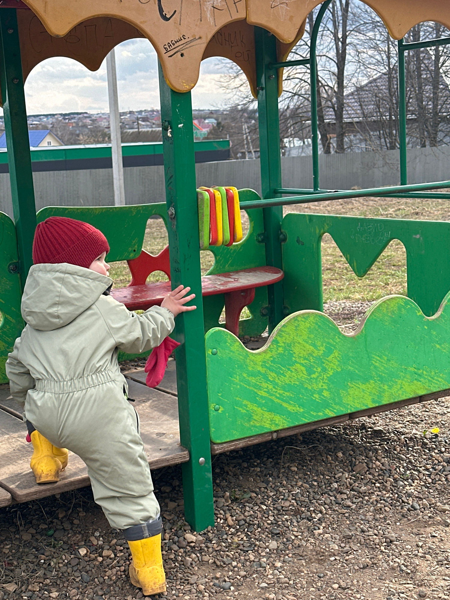 A child wearing a red beanie, light green snowsuit, and yellow boots plays on a green and yellow playground structure. The playground is surrounded by a gravel surface. In the background are trees andβ¦read more
