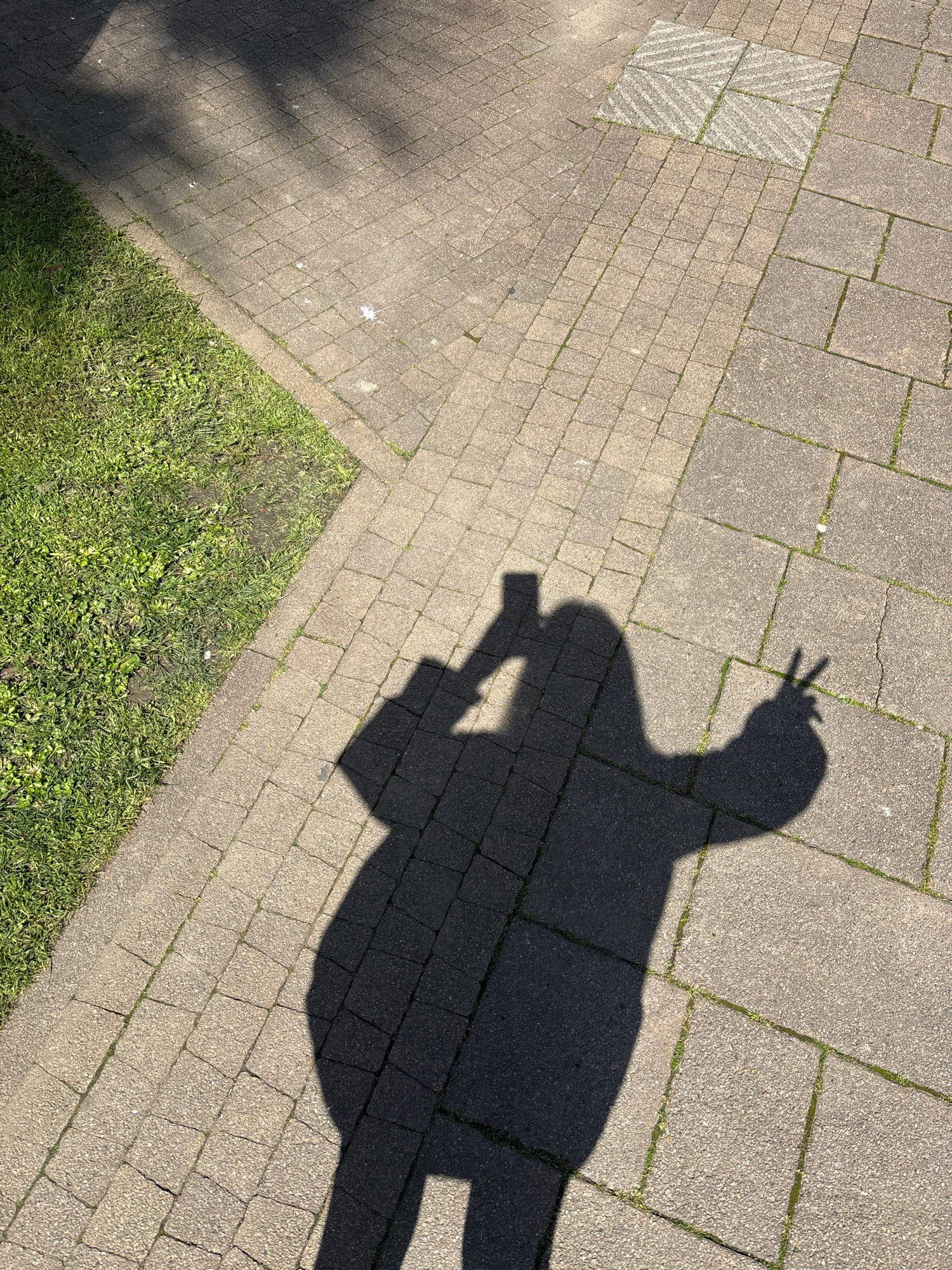 The image shows a section of a paved walkway next to a grassy area. The pavement consists of rectangular and square stones with grass growing in the seams. A person's shadow falls across the pavement.…read more