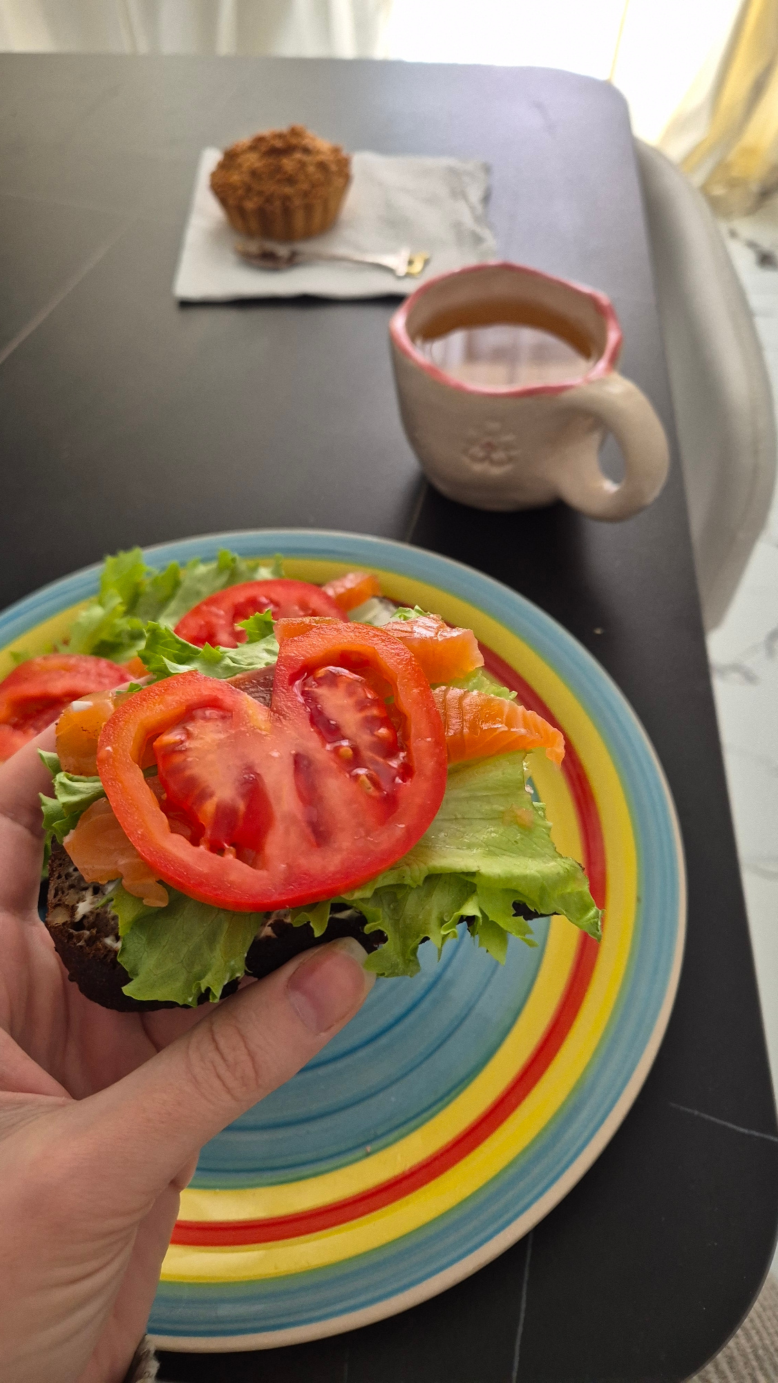On a black surface, a colorful plate sits beside a cream-colored mug with a pink rim, a white napkin, a spoon, and a muffin. The plate features concentric circles of light blue, yellow, and red. A han…read more
