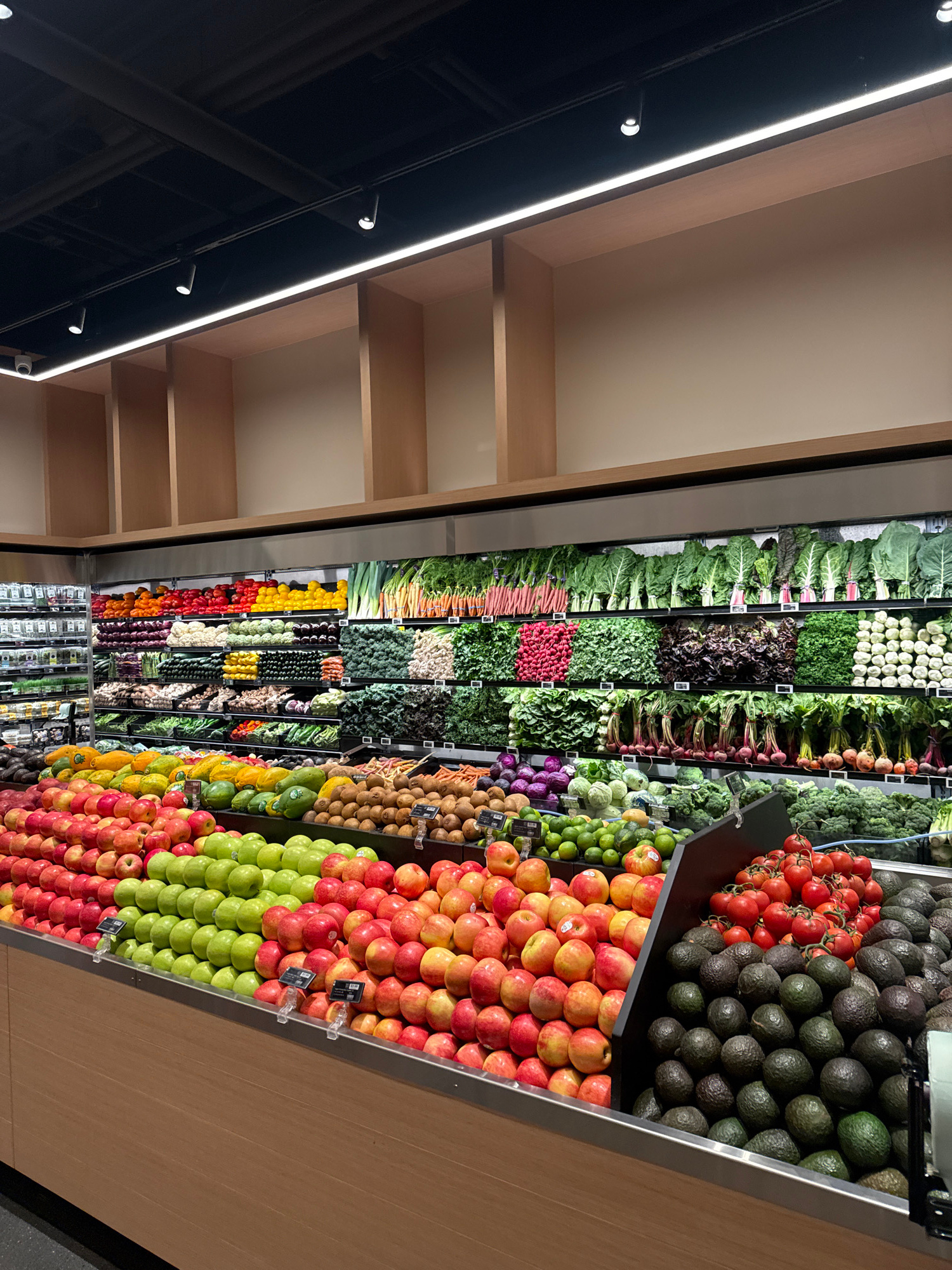 The image shows a produce display at a grocery store, likely in West Hollywood, United States of America. The display is brightly lit and filled with a wide variety of fruits and vegetables arranged i…read more
