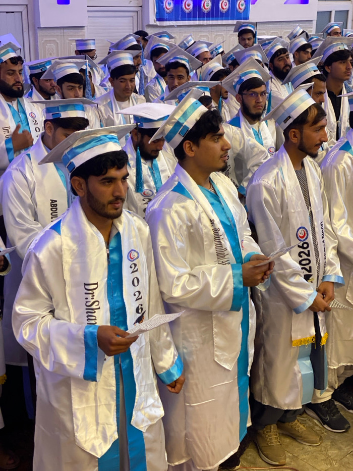 A group of men wearing white graduation gowns with blue accents and matching mortarboards are closely packed together. The gowns have names printed on them, such as "Dr.Shar" and "Abdul". The mortarbo…read more