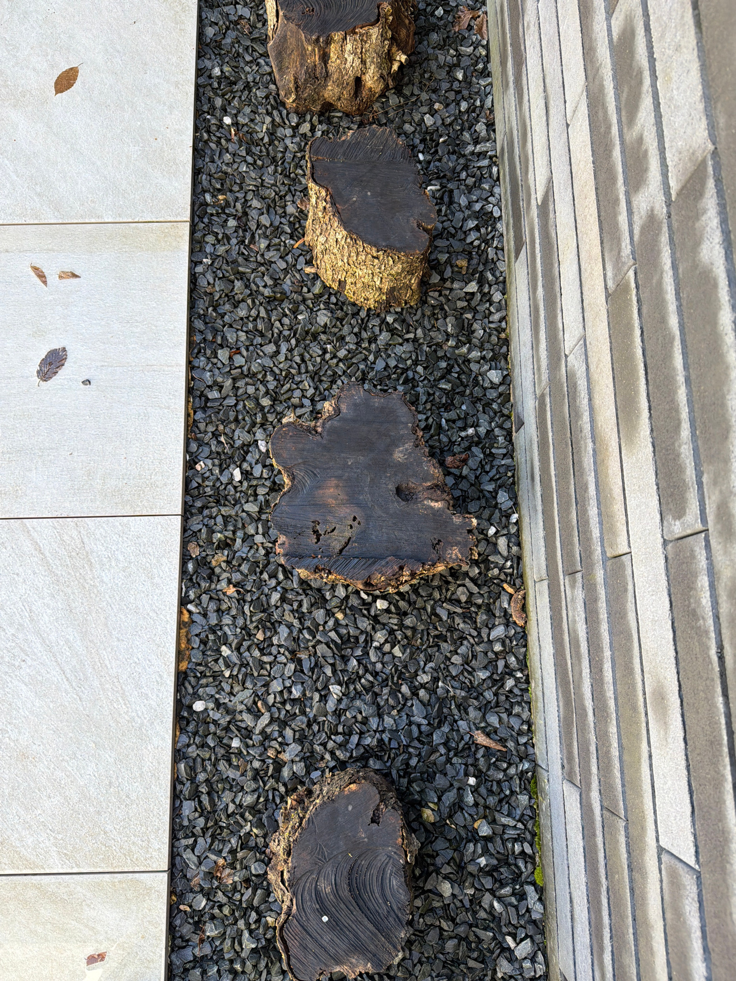 A high-angle shot depicts a garden scene in Junglinster, Luxembourg. The composition is framed by a grey brick wall at the top and light-colored stone pavers at the bottom. The central area is filled…read more